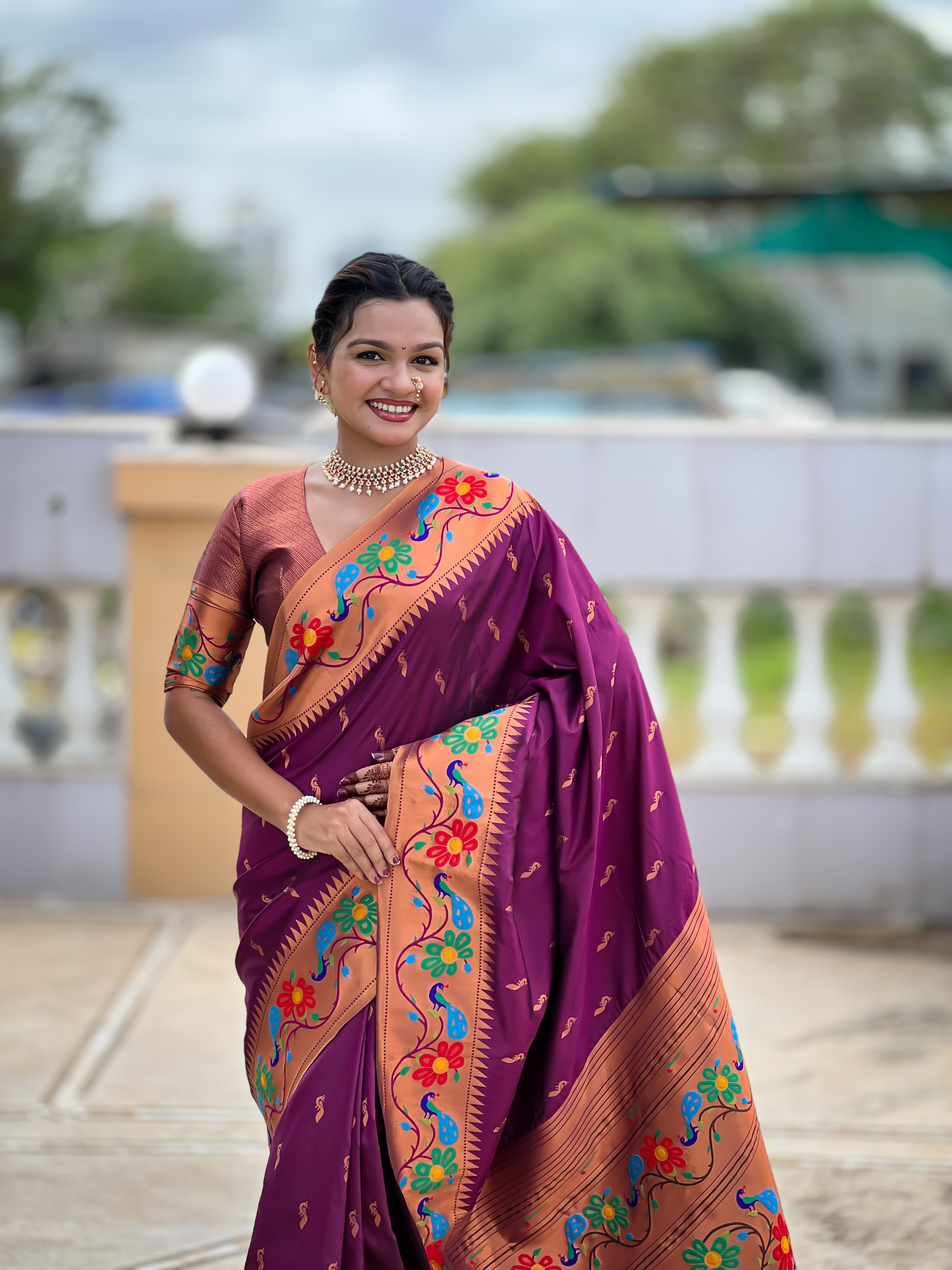 Wine Color Woven Meenakari Jacquard Designer Paithani Silk Fabric Ethnic Saree