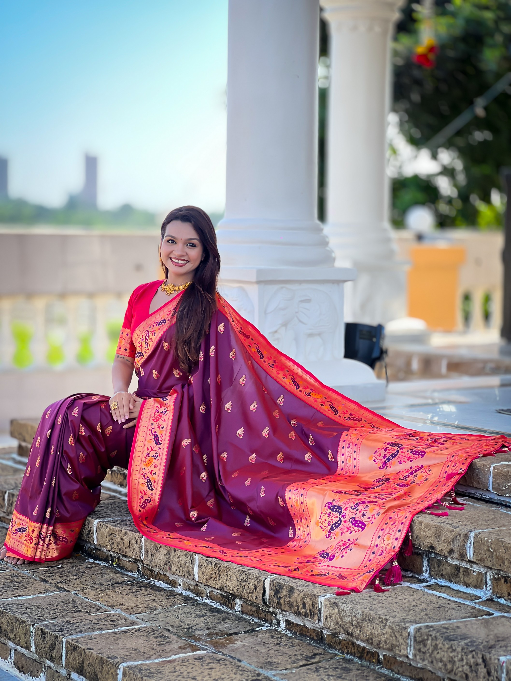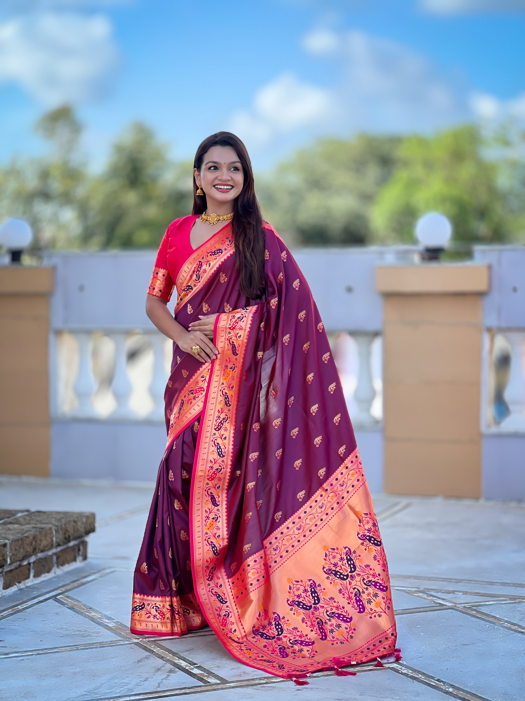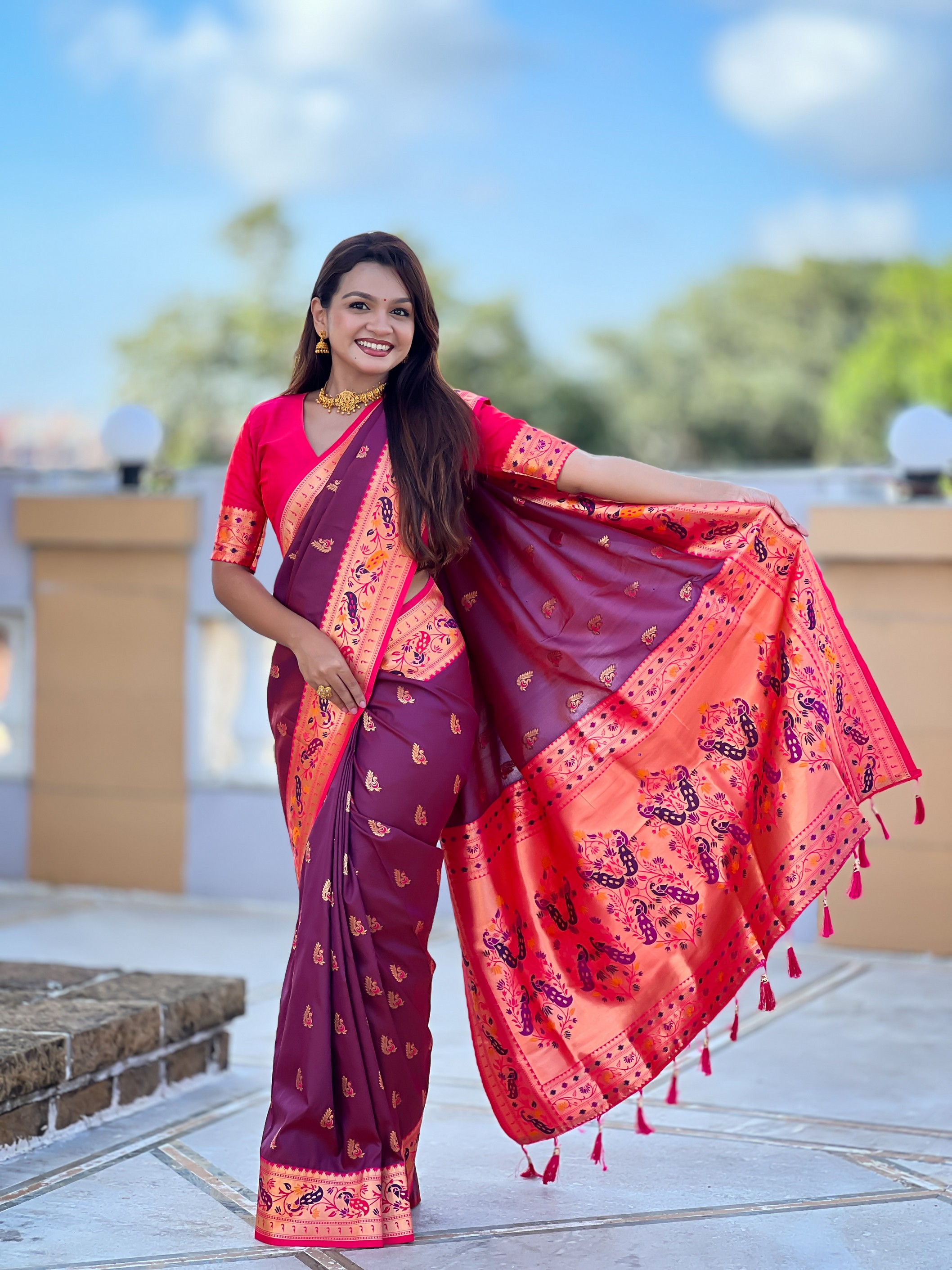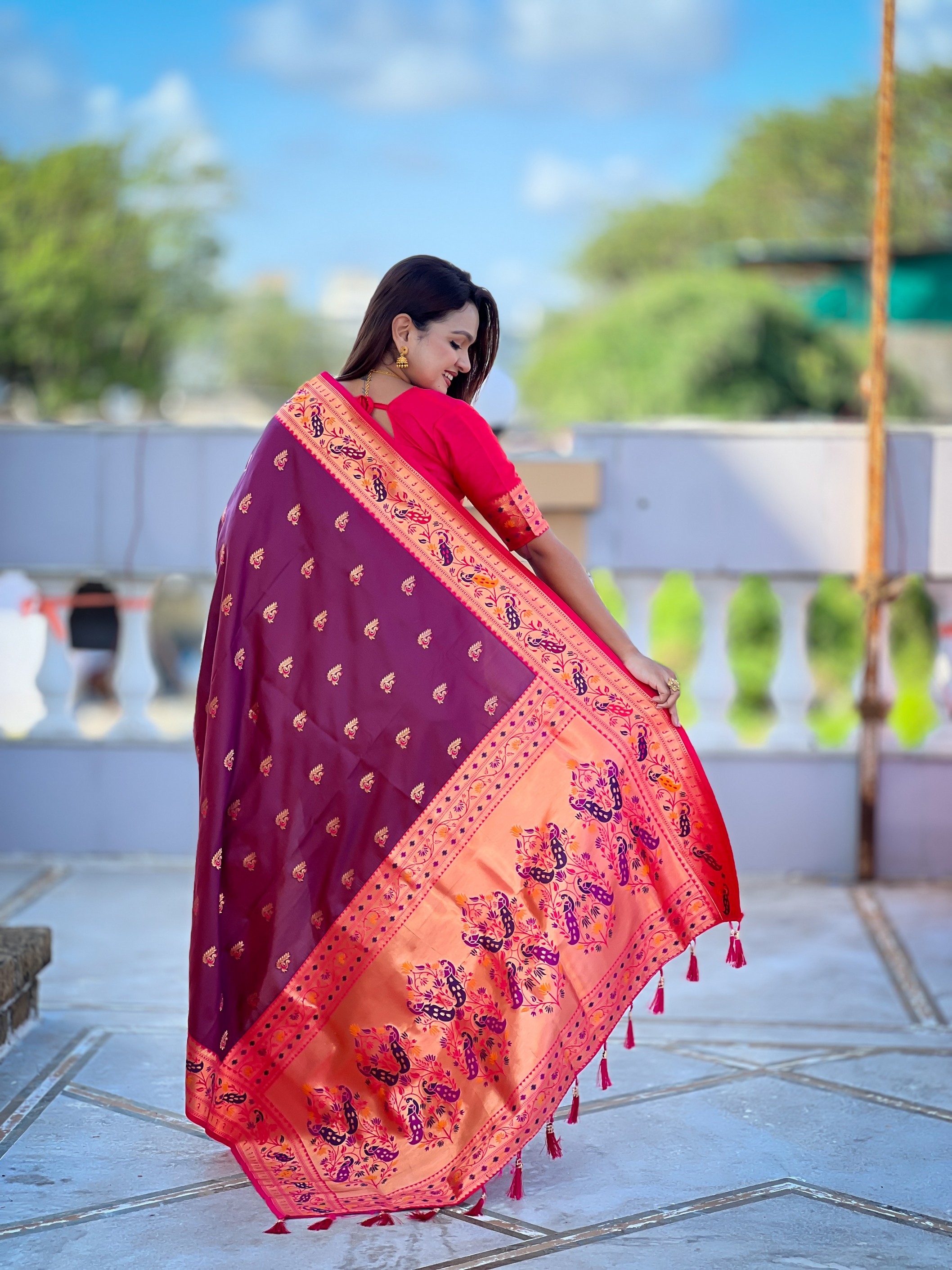 Woven Meenakari Jacquard Designer Wine Color Paithani Silk Saree
