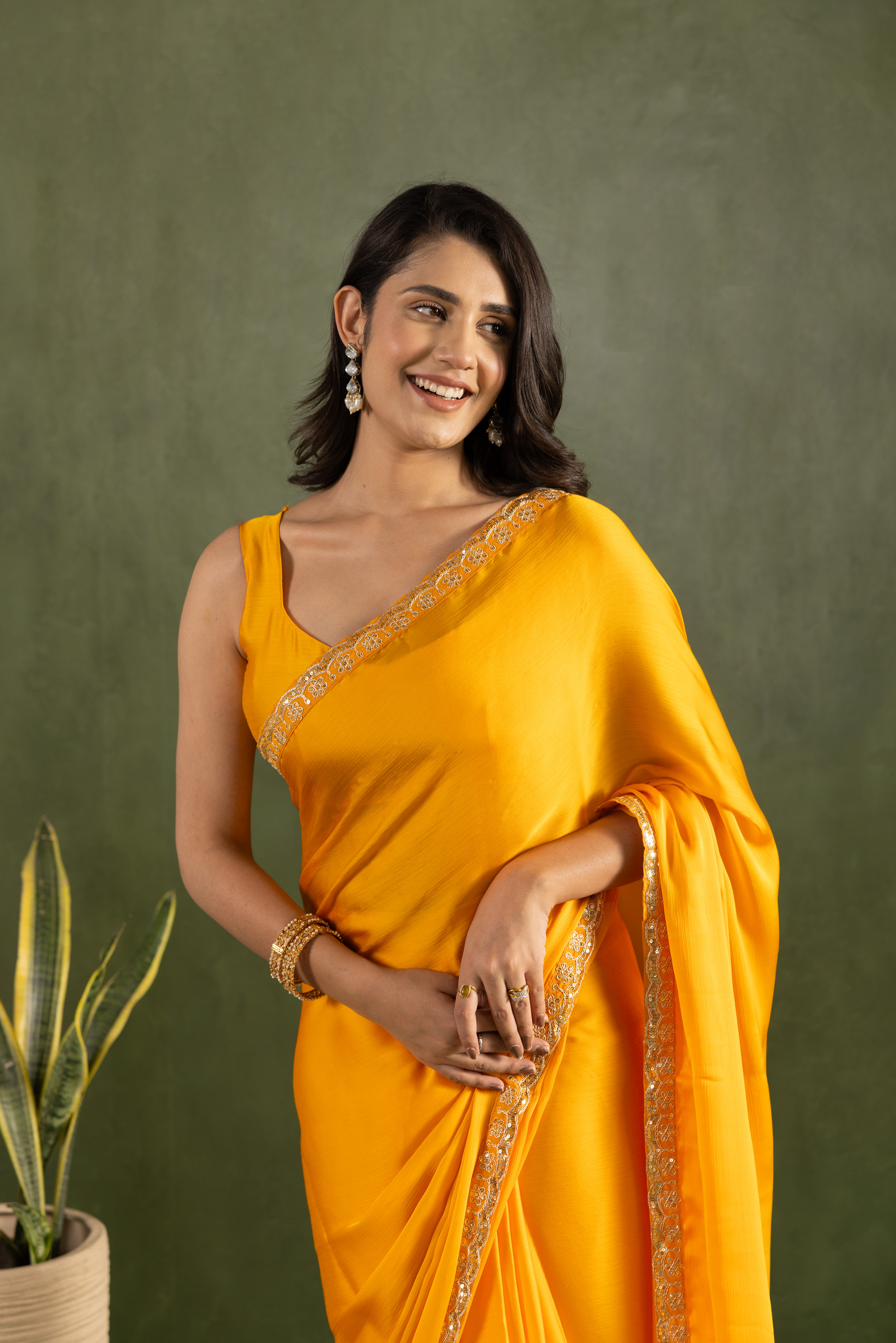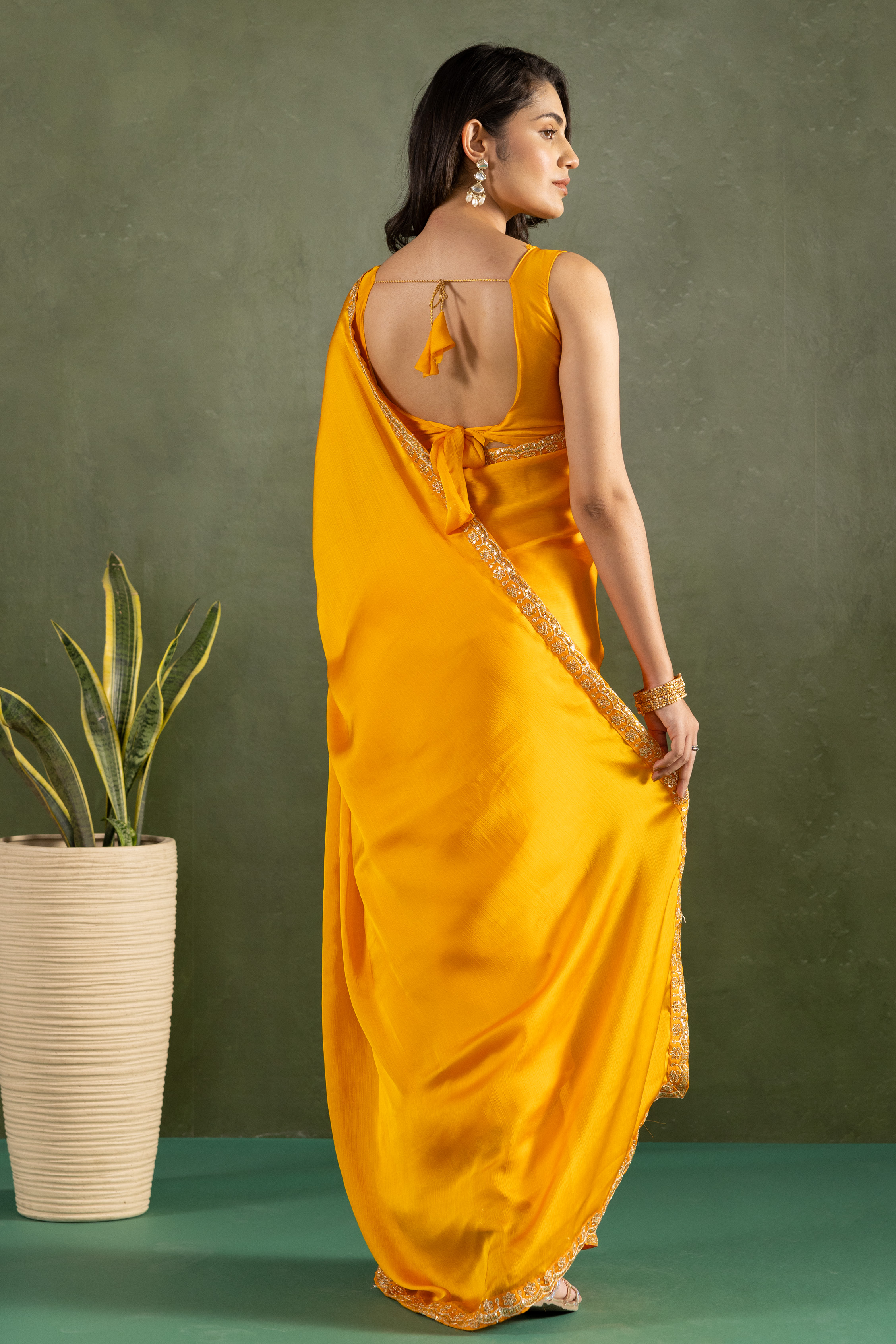 Yellow Color Chiffon Fabric Ready To Wear Designer Solid Partywear Saree