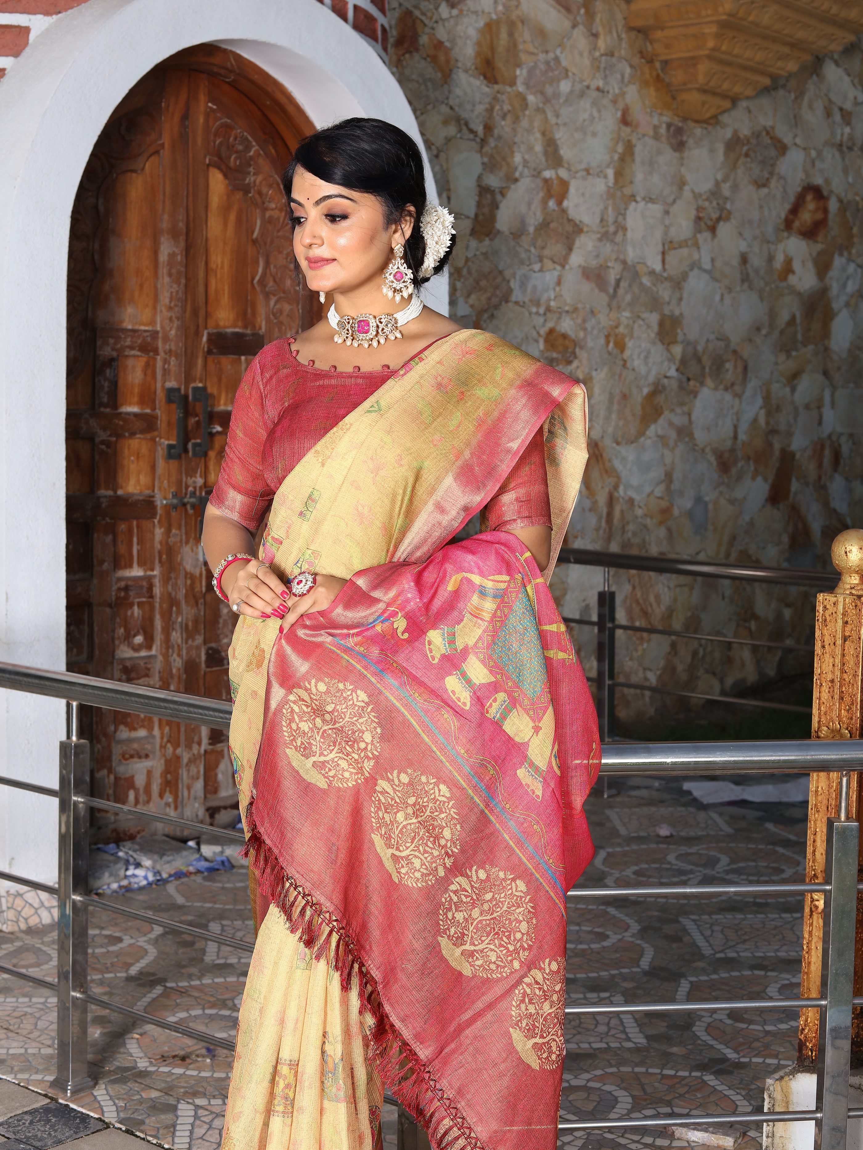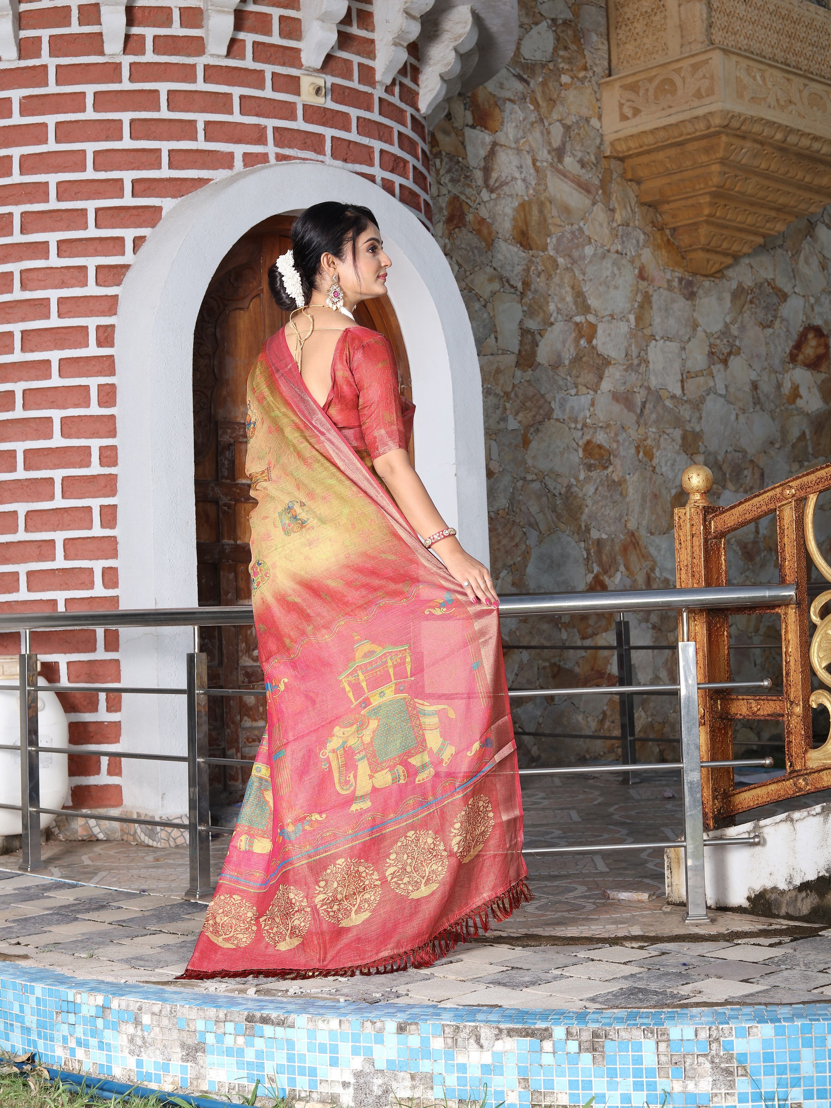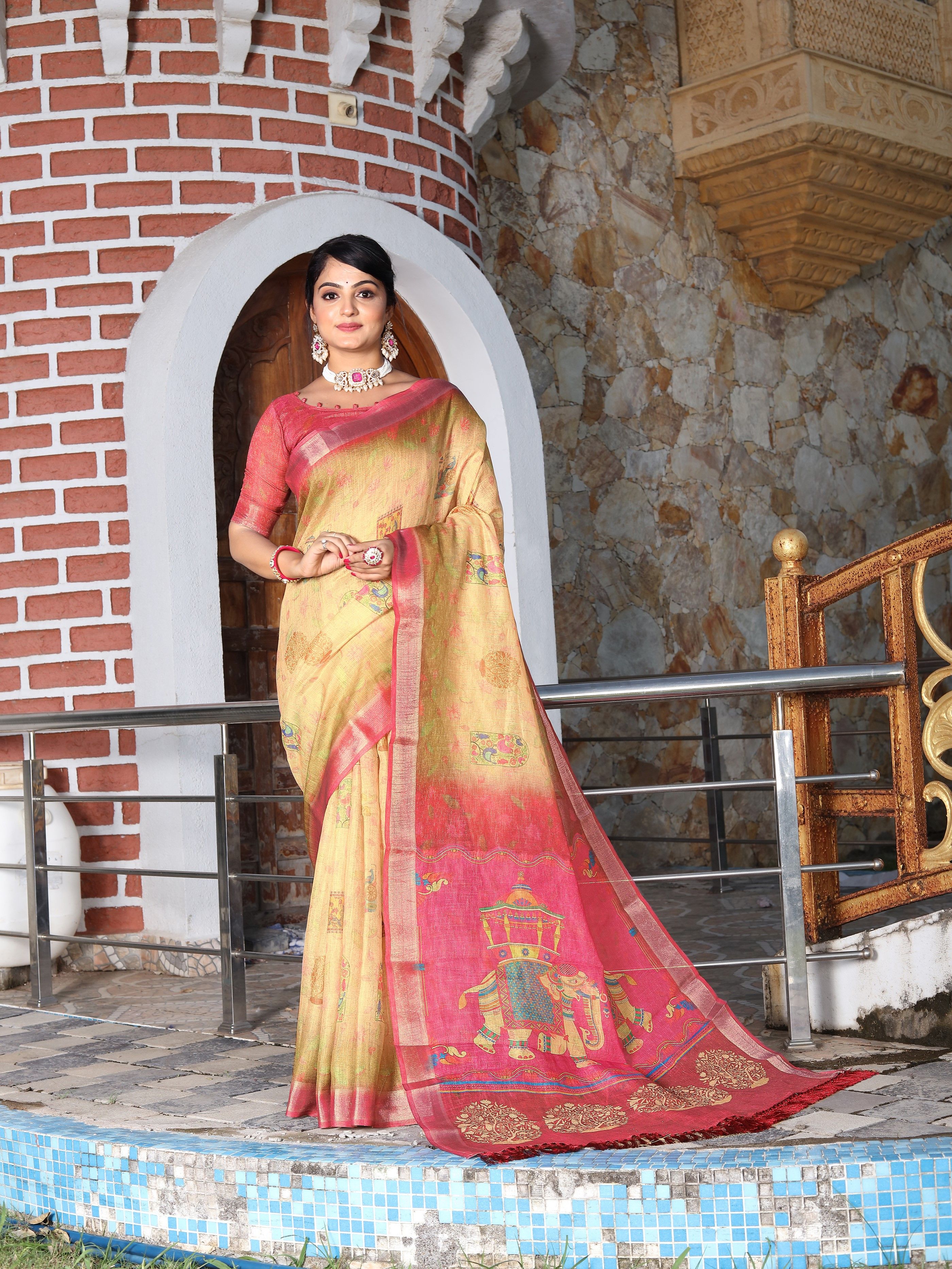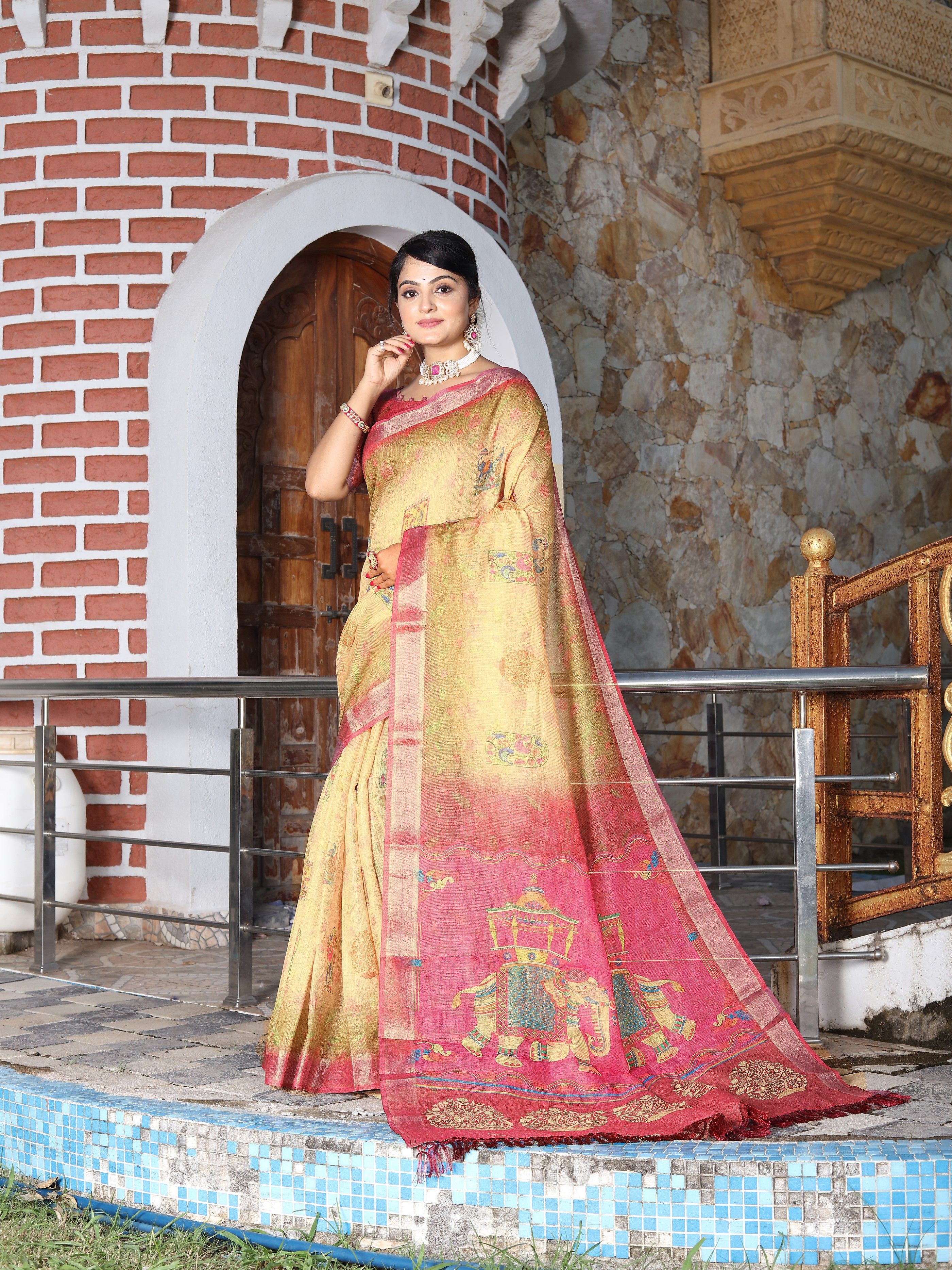 Yellow Color Cotton Shimmer Fabric Designer Printed Ethnic Girlie Saree
