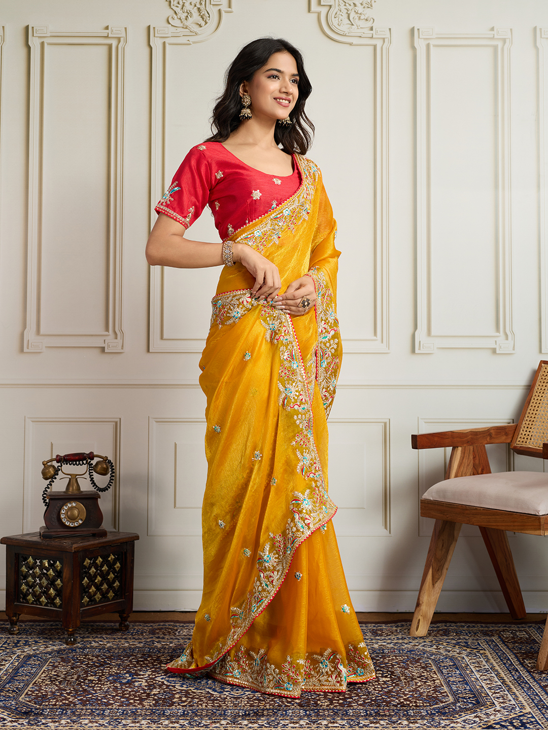 Yellow Color Frendy Chiffon Fabric Designer Embroidery Work Heavy Ceremonial Saree