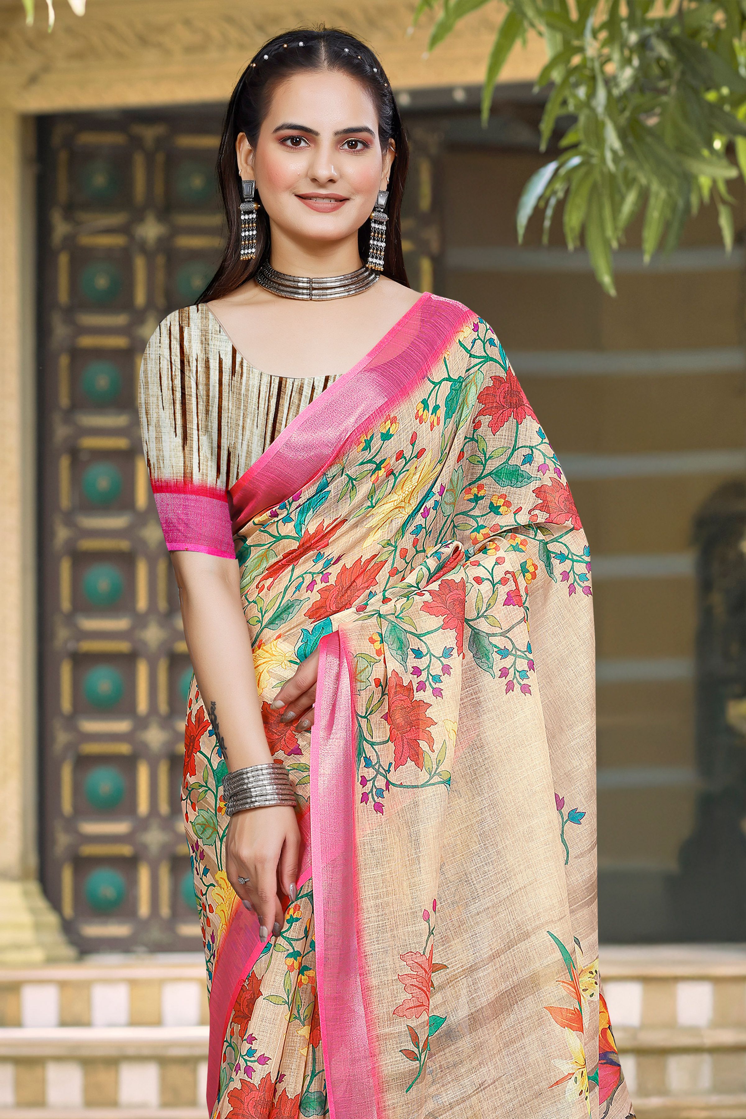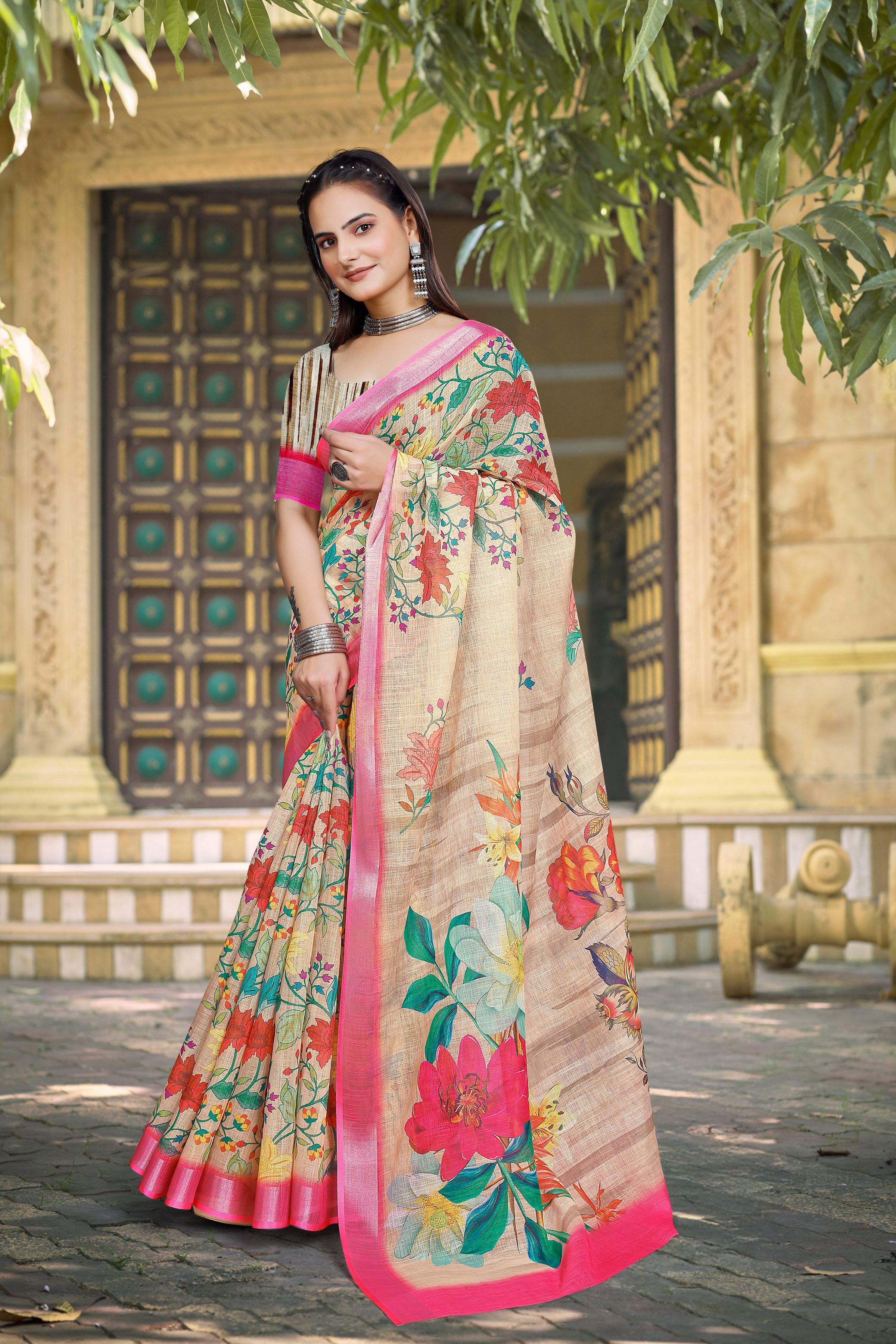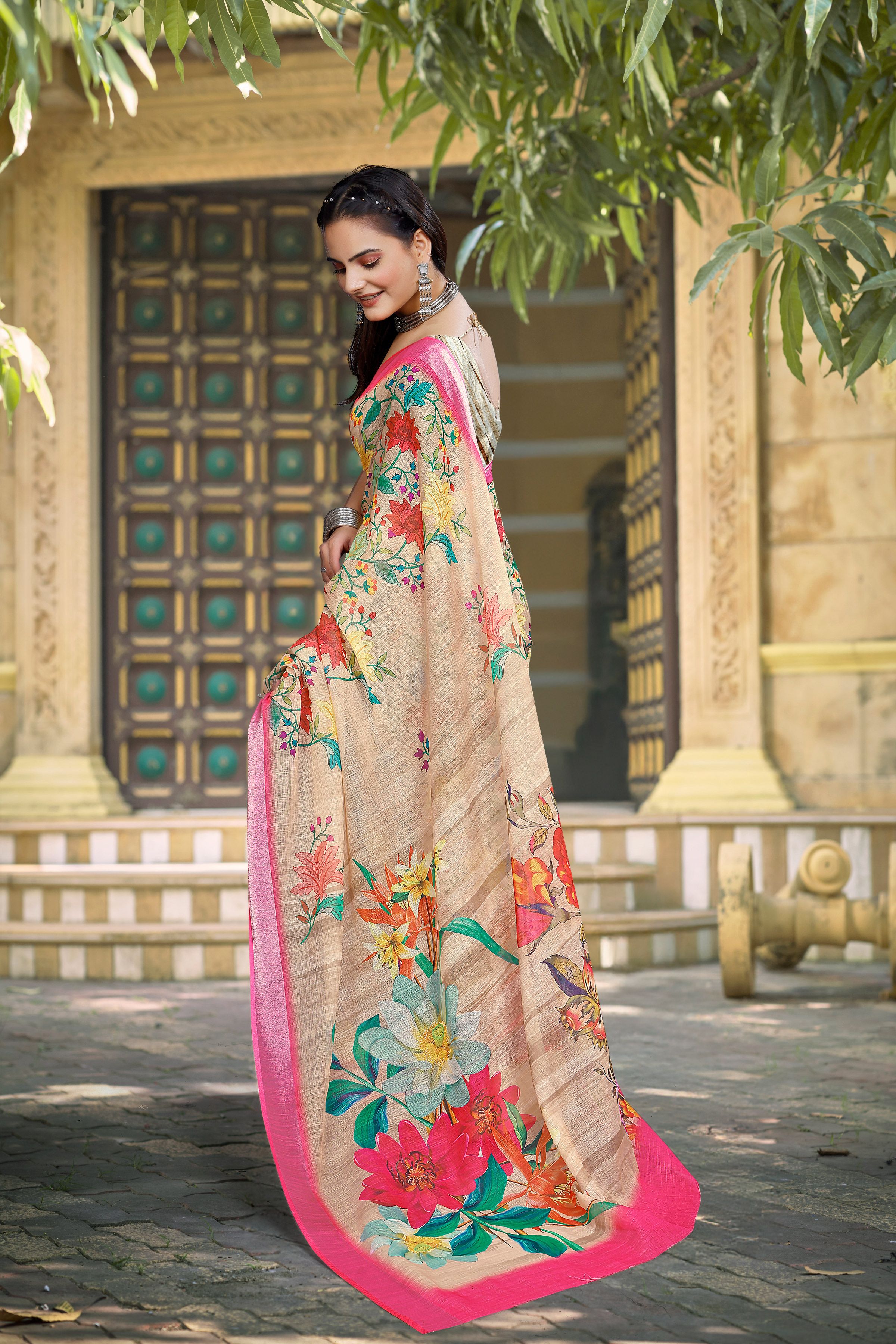 Look These Festive Saree in Fine Colored.These Saree Are Linen Cotton And Blouse is Fabricated On Linen Cotton Pair.Its Beautified With Woven Jari Border With Designer Digital Printed.