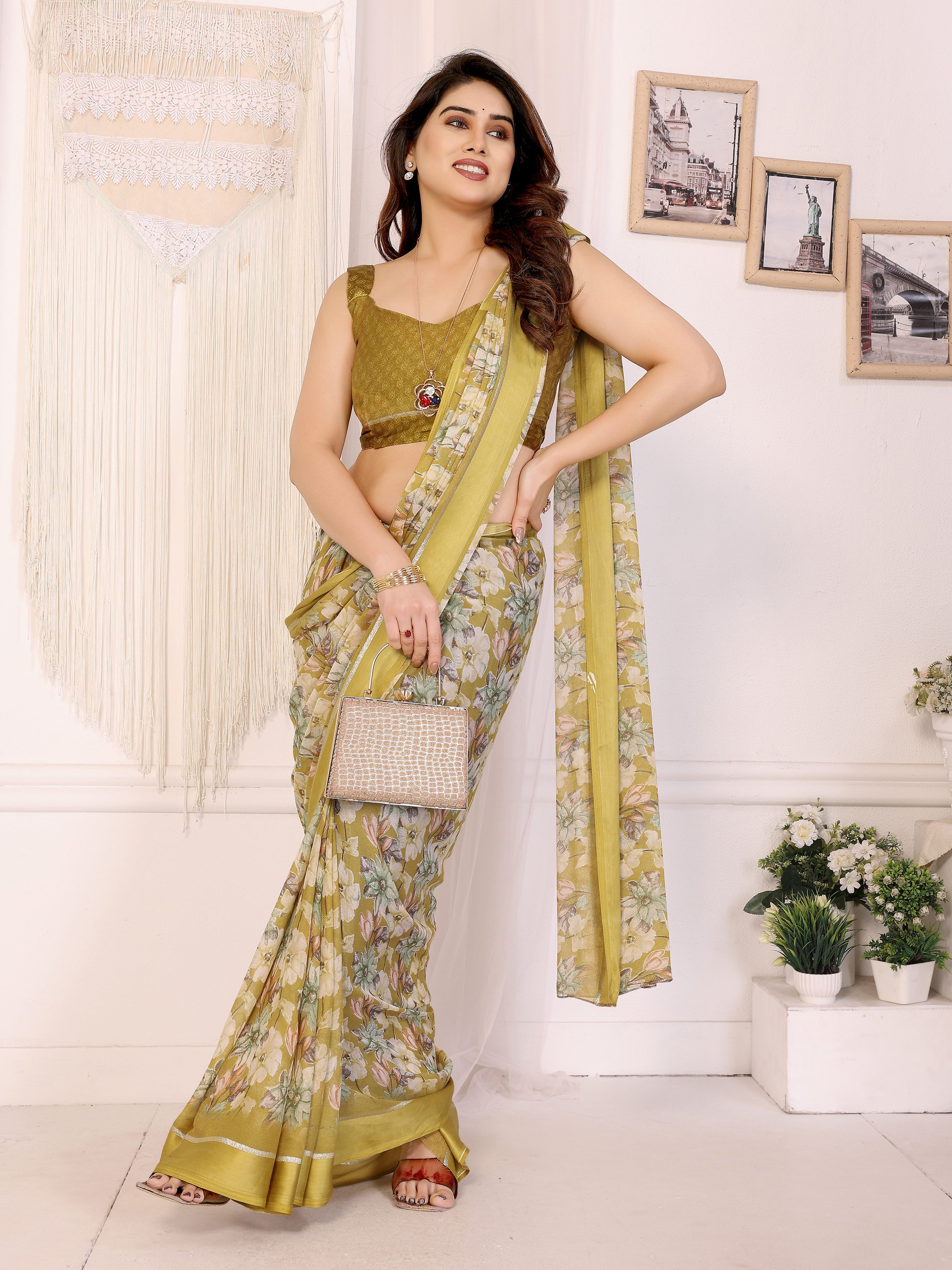 Yellow Color Moss Satin Patta Designer Flower Printed Ceremonial Saree