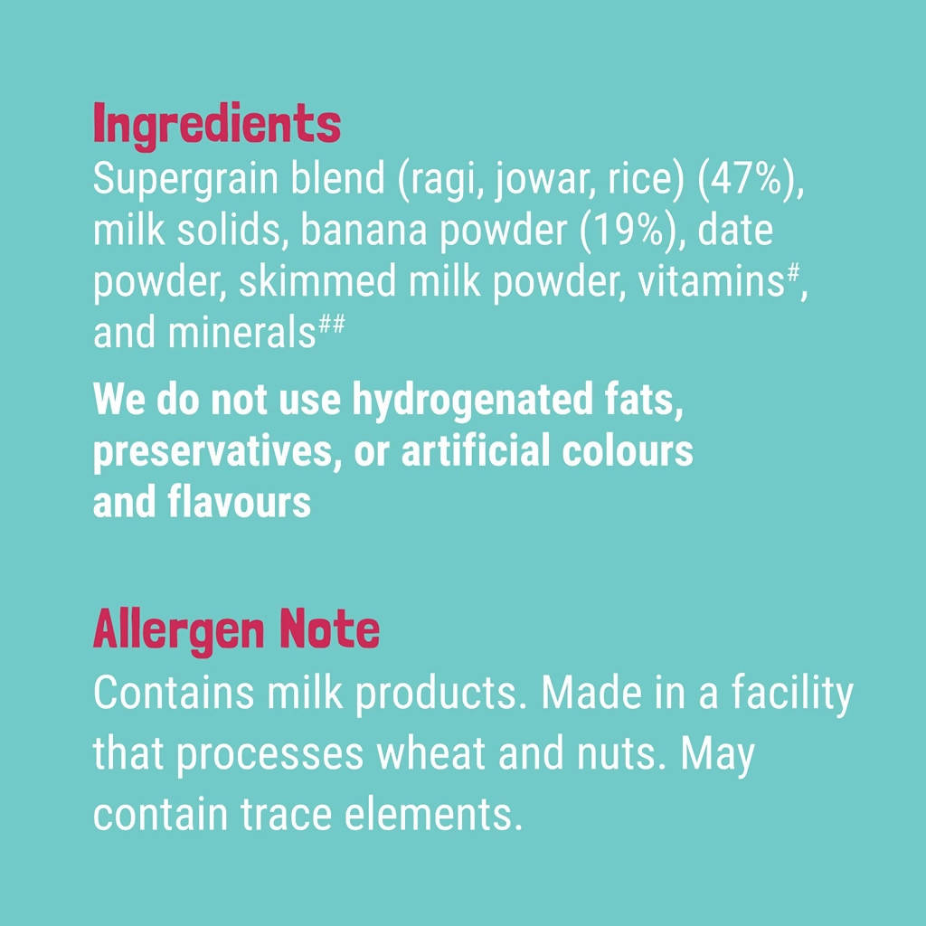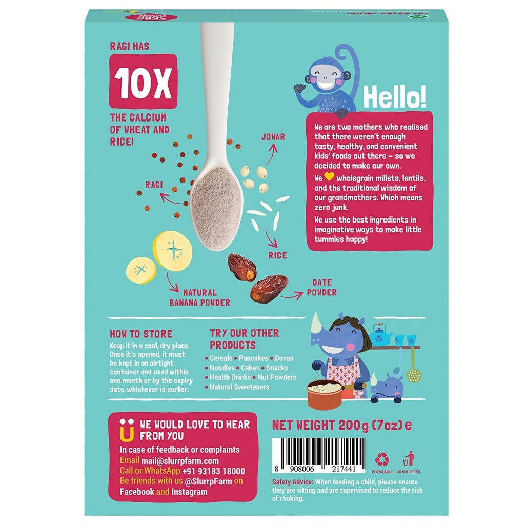 Slurrp Farm Banana, Ragi & Rice With Milk Cereal For Little OnesThis cereal is made with Slurrp Farm's Organic Grain Blend consisting of Ragi, Jowar & Rice along with Organic Brown Sugar, Banana Powder. This super healthy cereal will provide all the essential nutrients to your little ones.Ingredients:Slurrp Farm Organic Grain Blend (Ragi, Jowar, Rice), Milk Solids, Natural Banana Powder (19%), Skimmed Milk Powder, Vitamins and Minerals.Legal Disclaimer: Product images are for illustrative purposes only. Images/packaging/ labels may vary from time to time due to changes made by the manufacturer's manufacturing batch and lo