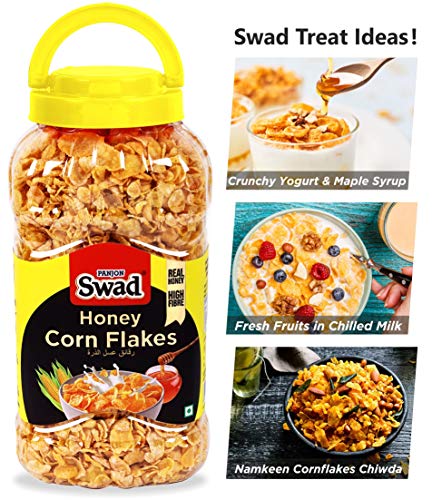 Size:300 g (Pack of 1)Swad presents its exclusive range of tasty & healthy breakfast cereals. Swad Real honey corn flakes is made with the goodness of golden corn gritsin a zero cholesterol formula to keep you charges up all day long. 100% natural ingredients multigrain power no preservatives rich in fibre vitamins iron & high in protein. It tastes great with hot or cold milk yoghurt ice creams or enjoy it as a snack with children kids friends & family. Available in 12 unique flavours: corn flakes honey cornflakes flakes vanilla flakes diet muesli muesli fruit & nut chocolate fills vanilla fills strawberry fills & Fruit rings & Fruit balls. Swad breakfast cereal honey corn flakes with real honey [zero cholesterol high fibre corn & iron rich]try all 12 Swad breakfast cereals to experience tastier & healthier breakfast everyday.