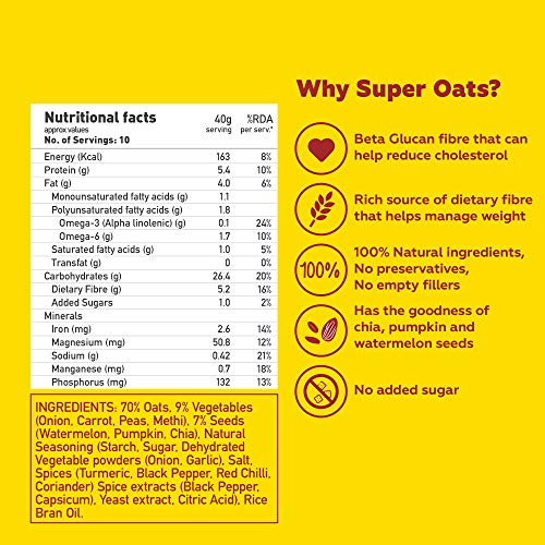 70% Oats 9% Vegetables (Onion Carrot Peas Methi) 7% Seeds (Watermelon Pumpkin Chia) Natural Seasoning Salt Spices Yeast Extract Rice Bran Oil.