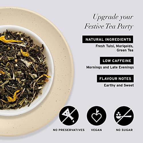 A PERFECT BLEND FOR A FESTIVE JOY: A calming blend of green tea from the Himachal Hills with marigolds and the sacred Tulsi leaves. Experience earthy sweet notes.