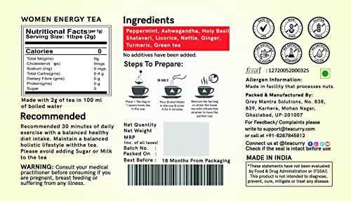 • 100% Natural Green Tea Energy and - Teacurry Women Energy Tea consists of Peppermint Holy Basil Shatavari Licorice Nettle Ginger Turmeric and Green Tea. All these provide the perfect blend for energy and it contains no no artificial flavours and is 100% V