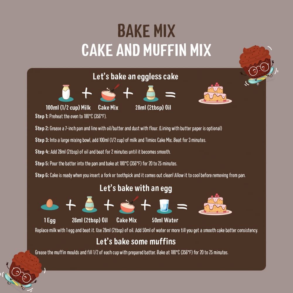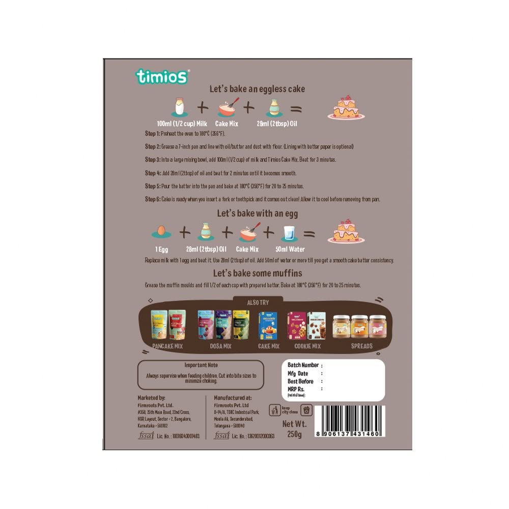 Timios introduces Bake mixes – Cake Mix. Loads of healthy goodness: Made with multigrains - wheat corn jowar and ragi and jaggery Timios Bake mixes are rich in Protein Iron and Calcium.
