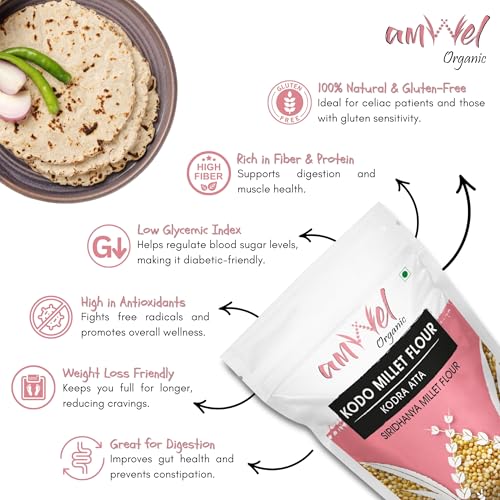 Amwel Kodo Millet Flour â A Gluten-Free Superfood for Healthy Living Amwel Kodo millet flour is a nutrient-rich gluten-free flour made from kodo millet an ancient grain cultivated in India for over 3000 years. Known for its high fiber protein and essential minerals this flour is an excellent alternative to refined grains. Traditionally consumed in South India it is gaining global popularity as a superfood for weight loss diabetes management and heart health. Different Names of Kodo Millet Flour Kodo millet is widely recognized by various regional names: Hindi: Kodra Flour (à¤à¥à¤¦à¤°à¤¾ à¤à¤à¤¾) Tamil: Varagu Maavu (வரà®à¯ மாவà¯) Telugu: Arikelu Pindi (à°à°°à°¿à°à±à°² పిà°à°¡à°¿) Kannada: Harka Hittu (ಹಾರà³à² ಹಿà²à³à²à³) Malayalam: Koovaragu Podi (à´àµà´µà´°à´àµ à´ªàµà´à´¿) Marathi/Gujarati: Kodra Flour (à¤à¥à¤¦à¤°à¤¾ à¤à¤à¤¾/àªà«àª¡àª°àª¾ લà«àª) Key Features of Kodo Millet Flour â 100% Natural & Gluten-Free â Ideal for celiac patients and those with gluten sensitivity. â Rich in Fiber & Protein â Supports digestion and muscle health. â Low Glycemic Index â Helps regulate blood sugar levels making it diabetic-friendly. â High in Antioxidants â Fights free radicals and promotes overall wellness. â Weight Loss Friendly â Keeps you full for longer reducing cravings. â Heart-Healthy â Packed with magnesium and potassium for better heart function. â Great for Digestion â Improves gut health and prevents constipation. Uses of Kodo Millet Flour ð½ Healthy Rotis & Chapatis â A perfect wheat alternative for soft nutritious flatbreads. 𥣠Porridge & Kheer â Ideal for energy-boosting breakfast meals. ð¥ Gluten-Free Dosa & Idli â Makes crispy dosas and fluffy idlis. ðª Baking & Snacks â Perfect for cookies cakes and millet-based snacks. ð Pasta & Noodles â Used for gluten-free and healthy pasta recipes.