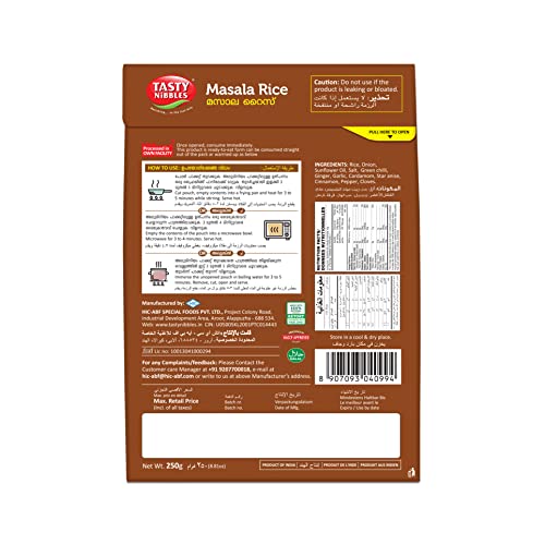 Tasty Nibbles Ready to Eat Masala rice made hygienically with Authentic recipe using retort technology. No added Preservative No added additives No added color / flavours No added MSG.