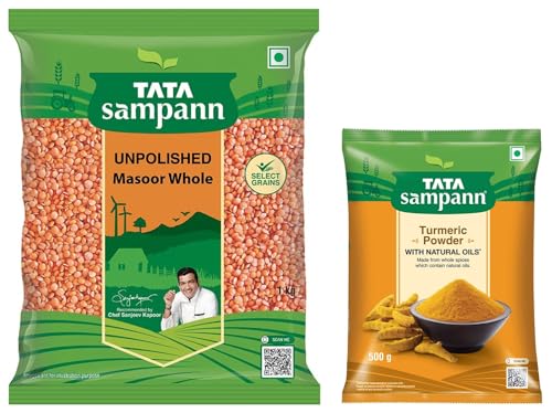 Tata Sampann Unpolished Masoor Dal (Whole) 1kgFor most Indians comfort food is always linked to easy-to-cook homemade meals and what can be more convenient and quick than preparing a hearty dal meal? Essential in every household Tata Sampann dals are unpolished and do not undergo any artificial polishing with water oil or leather thereby retaining their goodness and wholesome character. The 5-step process ensures that Tata Sampann grains are uniform and of premium quality giving you an all-natural authentic taste. A staple in the Indian diet Masoor Dal provides nutrients such as Protein & Fibre. Made of select grains and recommended by Chef Sanjeev Kapoor and Chef Ranveer Brar Tata Sampann Unpolished Masoor Dal makes for a delicious meal choice. So whenever you are in the mood to cook something easy and delicious dive into the scrumptious taste of Tata Sampann pulses and enjoy a lovely meal! Explore Tata Sampann Pulses range - Toor dal Chana dal Moong dal Moong dal Chilka Green Moong Masoor Small dal Kabuli Chana Masoor dal Kali Masoor dal Urad dal Urad Whole dal Urad Kali Kala Chana and Rajma. Storage Instructions: Store in a cool and dry place. Transfer contents to an airtight container after opening.Tata Sampann Turmeric Powder With Natural Oils 500gTata Sampann's range of spices are crafted not just to satisfy your taste buds but also to take care of your health. Made from whole spices that contain natural oils haldi has an active ingredient called curcumin. With no added preservatives this turmeric powder can be teamed up with pulao greenies vegetable soup or smoothies the choice is yours! Storage Instructions: Store in a cool and dry place.