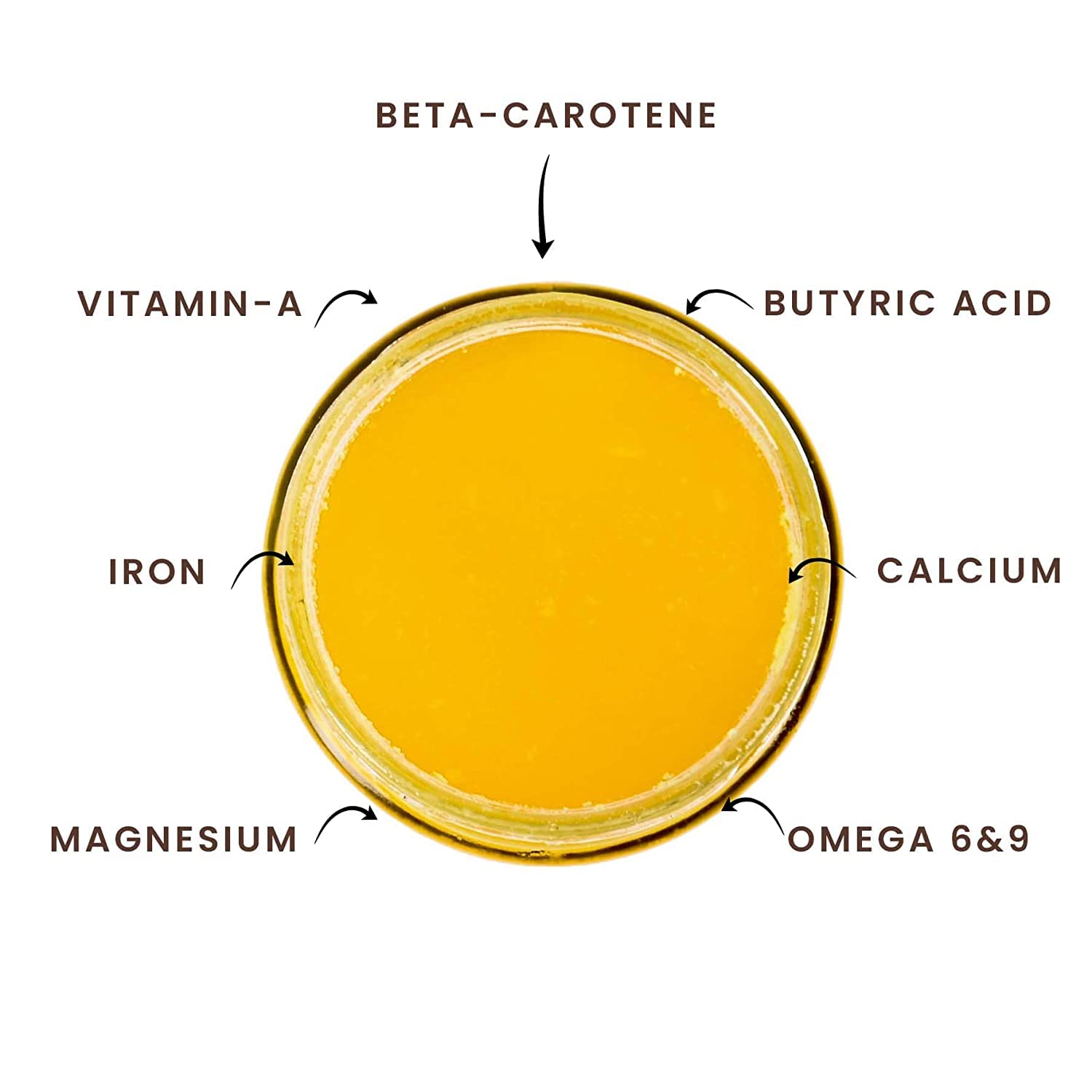 The A2- Grade Milk that is used to extract this milk ghee is known to be one of the healthiest cow milk to have ever existed. Such grade milk is found in the Gir cows and is turned into ghee using the Bilona method of churning. With the right sentiment of feeding the calves first, the milk is then collected from the cows and put to boil in earthen pots. After boiling the milk on wood and fire, it is left outside overnight for it to curdle. The curdled milk is then churned which separates the buttermilk. The bilona method ghee then generates 100% A2 Gir Cow Ghee often known as Bilona Ghee or Bilona Method Ghee.