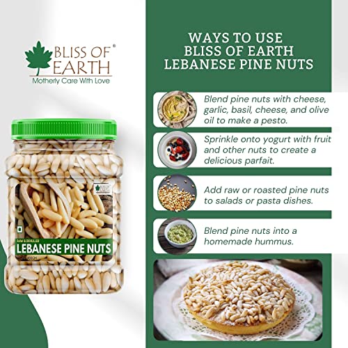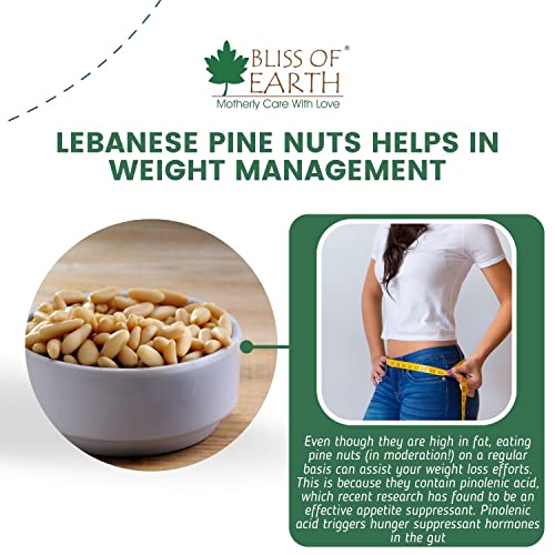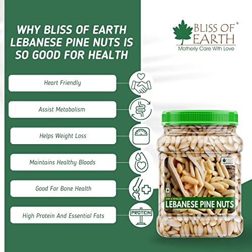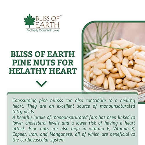 Bliss of Earth Naturally Organic pine nuts are crunchy yet buttery textured pleasantly sweet and delicious small edible seeds (kernels) of the female cone on a pine tree. Pine kernels are indeed a splendid source of plant-derived nutrients essential minerals vitamins and "heart-friendly" monounsaturated fatty acids that help health immensely by reducing bad cholesterol levels in the blood.