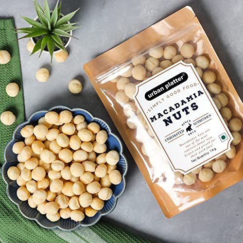 Urban Platter Bold and Exotic Macadamia Nuts 1kg (Grade A Premium Quality Crunchy perfect for guilt-free snacking)These nuts can be consumed as they are or with tea/ coffeeCan be roasted and salted to give oneself a delightful treat They have the highest amount of beneficial mono unsaturated fats of any known nut. Thus they are considered great for patients with hyperemia and You can dip them in chocolate sauce and freeze to get yummy chocolate flavored macadamia nuts Once opened refrigerate and use macadamia nuts within two months