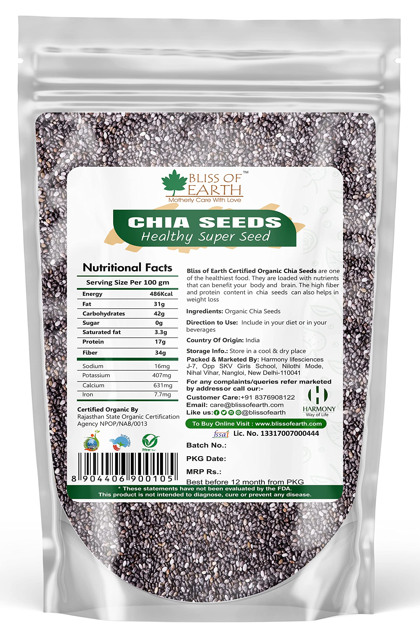 Bliss of Earth Chia Seeds are one of the healthiest food. They are loaded with nutrients that can benefit your body and brain. The high fiber and protein content in chia seeds can also helps in weight loss.