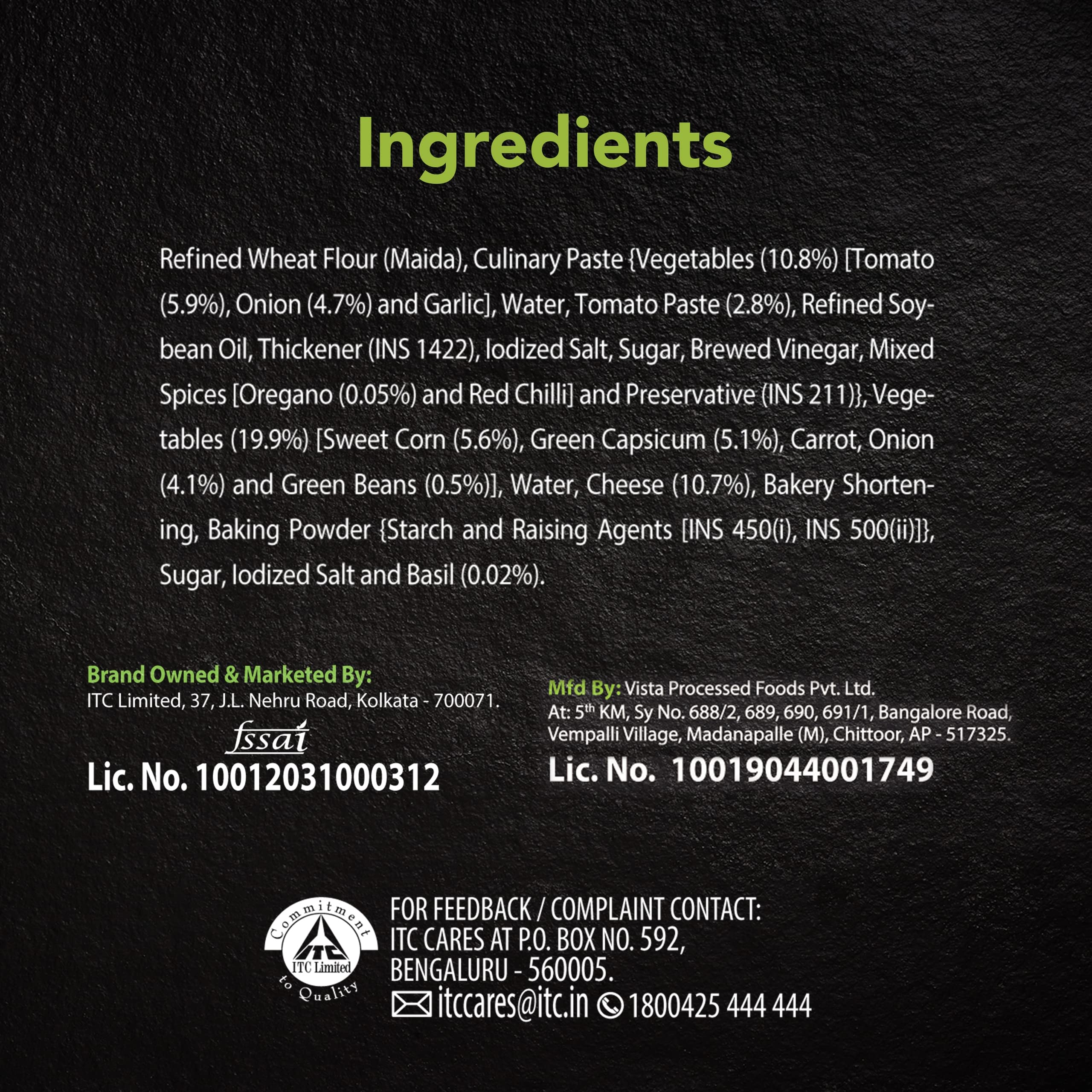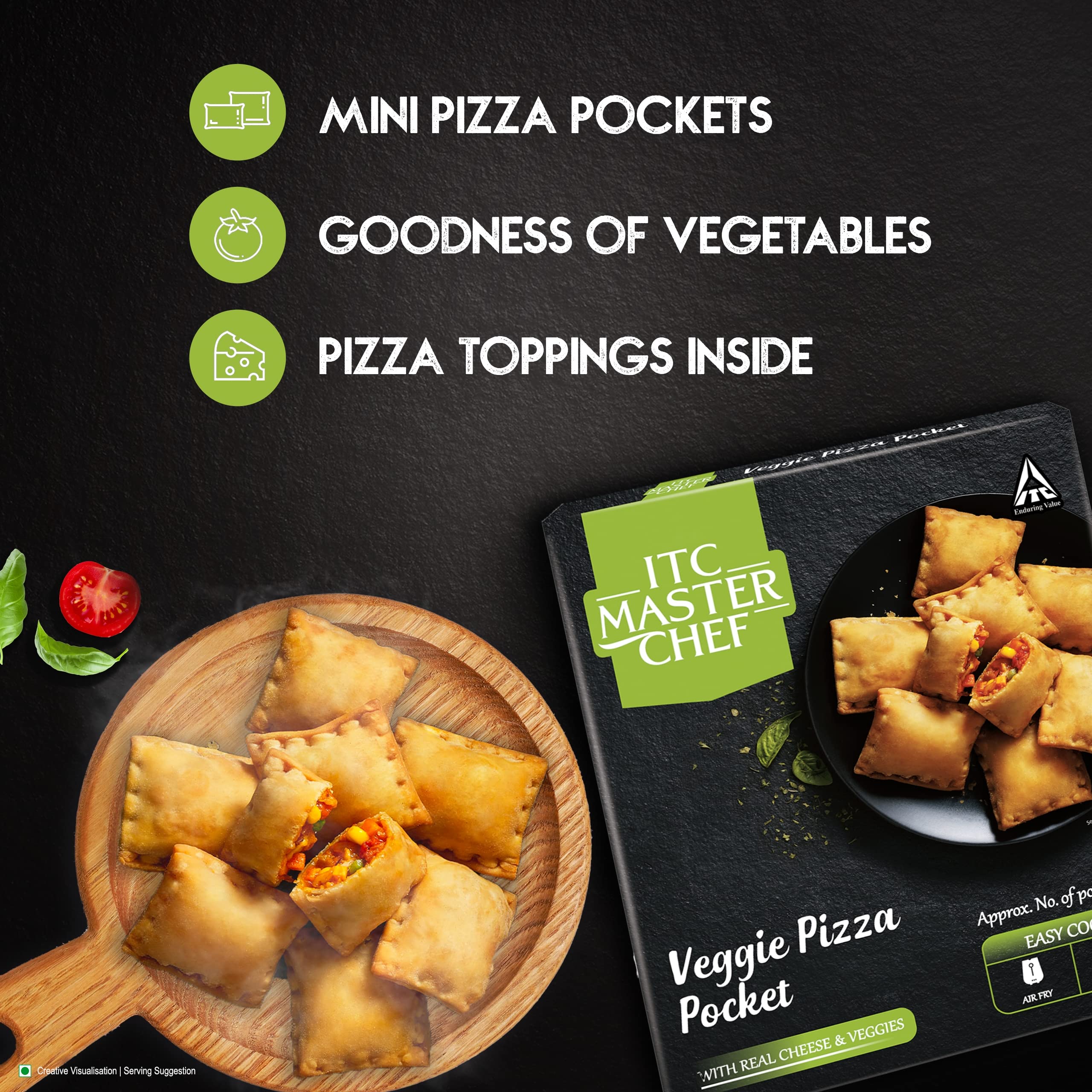 The happiness of a slice now packed inside a yummy pocket. Presenting ITC Master Chef Veggie Pizza Pocket a classic pizza treat in small bite-sized pockets or how we like to call it âfun pockets'. This tasty snack is loaded with real cheese and vegetables and can be enjoyed in a matter of minutes. ITC Master Chef's frozen Veggie Pizza Pockets are available in a ready to cook pack. It has a puff coating filled with your classic pizza toppings like capsicum onion sweetcorn and oregano. You can serve this delicious treat with some refreshing drinks or as a spread for house parties. Be it kids or adults everyone is going to love this snack.Each ITC Master Chef frozen food recipe is crafted keeping in mind the tastebuds and preferences of Indian customers. The dishes are frozen using IQF (Individually Quick Frozen) technology which keeps the taste intact till the time you open the pack for cooking. These frozen food products are made with the finest ingredients and come with the promise of the highest quality and taste. You can even pair these frozen snacks with different foods or try out some scrumptious recipes from our website. Experience all the excitement of a pizza with these tasty pizza pockets. Next time you plan a party at home don't forget to get yourself a ready to cook pack of Veggie Pizza Pocket by ITC Master Chef.