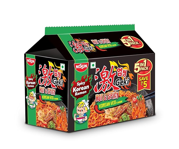Geki Nissin Hot & Spicy Korean Ramen Instant Veg Noodles | Fiery Korean Flavors with Premium Ingredients for a Quick, Delicious Meal | 400 gm (5 in 1 pack)