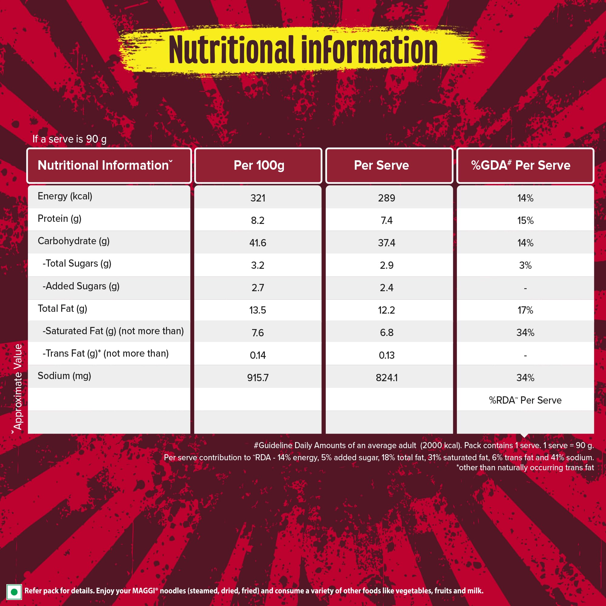 A fiery bowl of flavour that truly packs a punch! Big fan of spicy noodles and looking for something delicious for your taste buds? Well look no further! India' favourite brand MAGGI is finally here with the long-awaited Korean noodles! Indulge in a spicy affair with this instant noodles where Korean barbeque meets fiery chilli that truly hits the spot! MAGGI Korean BBQ veg noodles offer an irresistible fusion of world-famous Korean flavours and the classic MAGGI twist. These instant noodles are perfect for your go-to snack when craving something hot delicious and quick. So grab your chopsticks and enjoy this fiery bowl of delicious ramyeon anytime! How to Cook: Add noodles to 400 ml (approx. 2 cups) of boiling water and cook for 3 mins in an open pan. Drain out the water. Add seasoning mix and seasoning oil. Mix well. Add your favorite toppings to make the perfect Ramyeon & serve! Storage Instructions: Store in a cool dry hygienic place to protect from insects pests & strong odours.