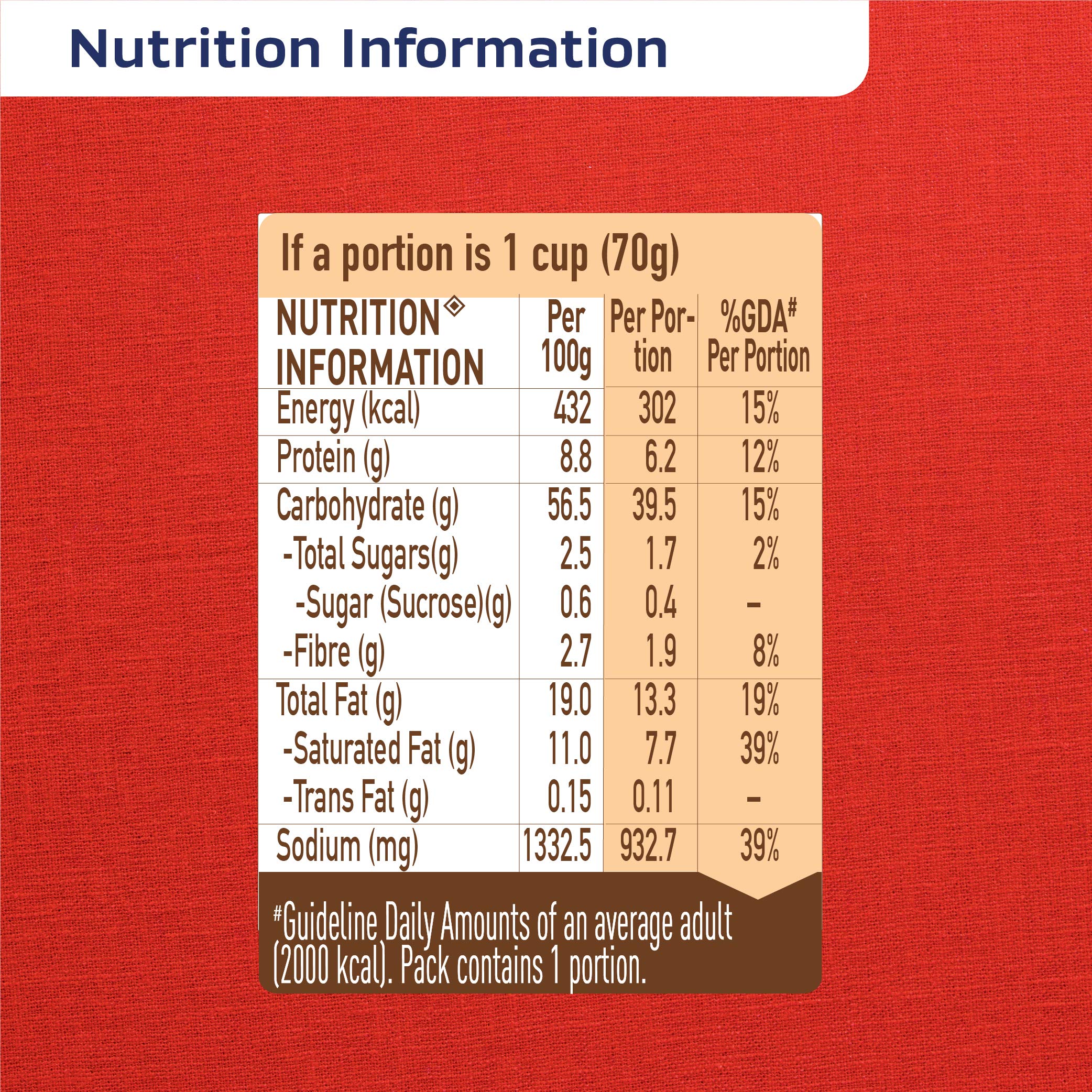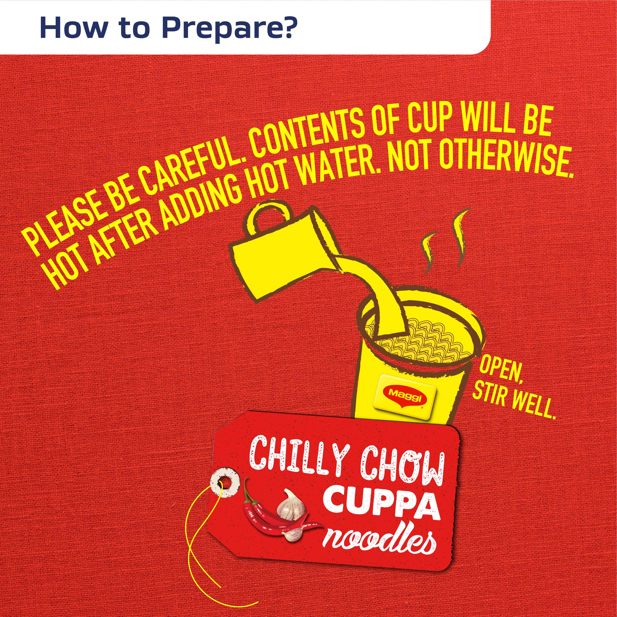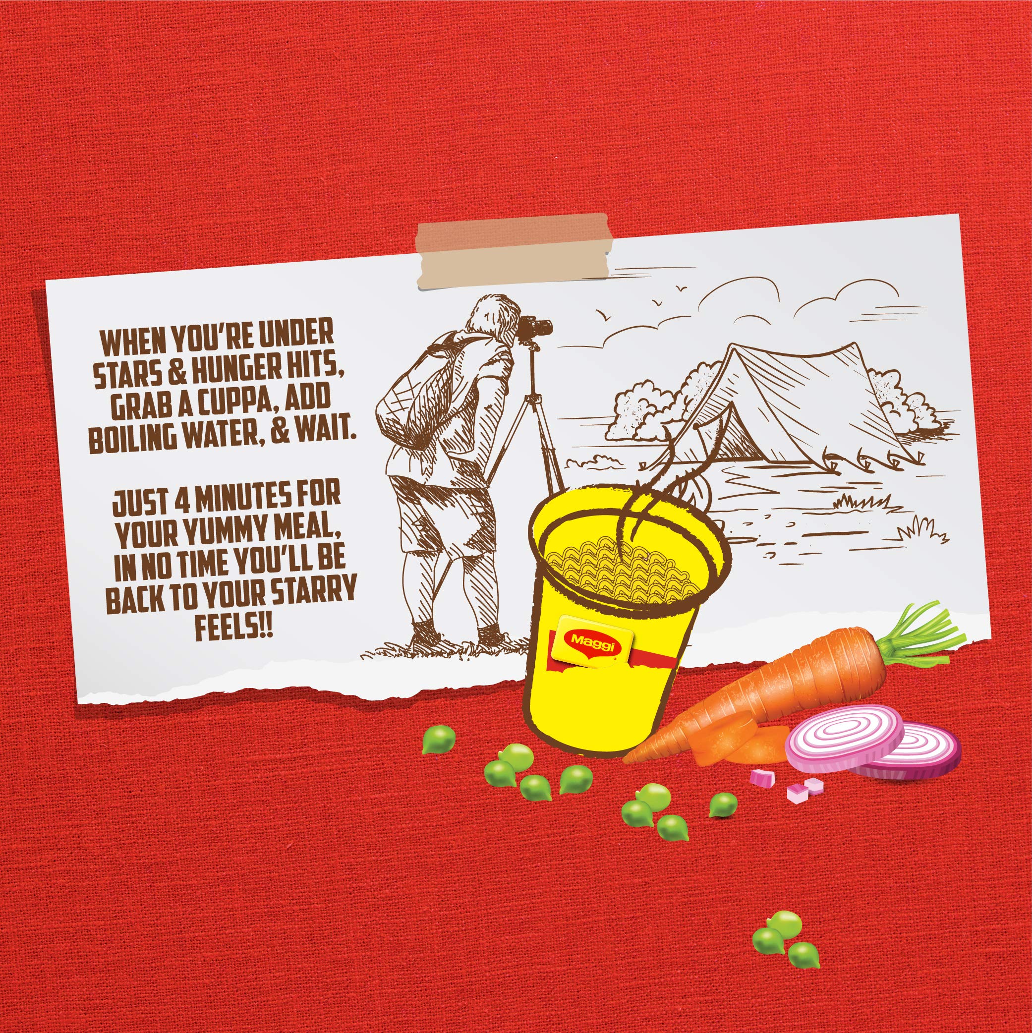 Your on-the-go noodles Maggi Cuppa offers you the delicious taste of Maggi combined with the convenience of cup noodles! It is an ideal offering for the new generation pressed hard for time trying to juggle multiple roles all at once & can be enjoyed anytime on the go.Containing a delicious Chinese masala taste Maggi Cuppa noodles are made with the finest quality spices and ingredients. The pack comes with Tastemaker already added and a fork inside for maximum convenience even on the go.Usage Instructions: When you are on the trail and hunger hits grab a Cuppa add boiling water and wait just 4 minutes for your awesome snack. In no time you’ll be back on track. Serving Instructions: Serve hot Allergens: May contain milk solids and soya. Storage Instruction: Store in a cool dry and hygienic place to protect from insects pests and strong odours.