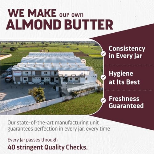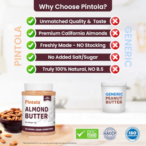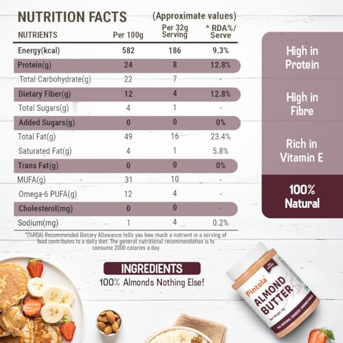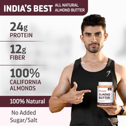Pintola's all natural almond butter is made up from the finest grade fresh crunchy and nutritious california almonds from an iso 22000 haccp and brc (European Standards) certified and fssai approved factory. This product is the purest form of almond butter and we specially introduced for gym goers dieters and joggers. Keep in your bag for getting instant energy anywhere anytime. All natural almond butter is an unsweetened and loaded with protein fibre and good fats. There may be oil separation on top of the jar as there is no stabilizer in the product. Please stir it back in every time you use. Try to finish the almond butter within two months after the opening seal.