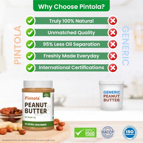 Do you like crunchy over creamy? Try this extra crunchy product from pintola. Pintolas all natural peanut butter is made up from the finest grade fresh crunchy and nutritious peanuts from an iso 22000 haccp and brc (european standards) certified and fssai approved factory. This product is the purest form of peanut butter and we specially introduced for gym goers dieters and joggers. Keep in your bag for getting instant energy anywhere anytime. All natural peanut butter is an unsweetened and loaded with protein fibre and good fats. Note: there may be oil separation on top of the jar as there is no stabilizer in the product. Please stir it back in every time you use. Try to finish the peanut butter within two months after the opening seal.