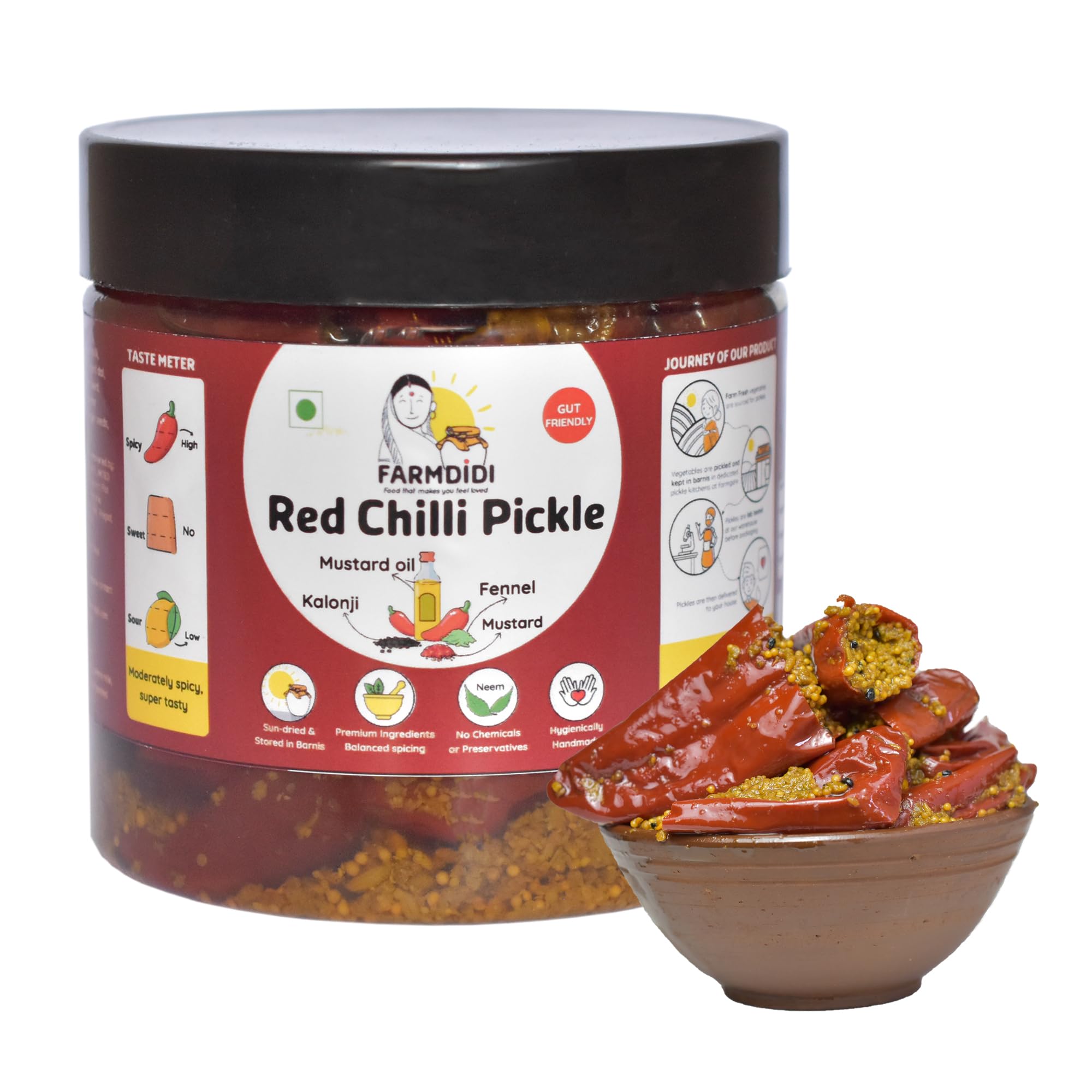 • HOMEMADE BY FARMER DIDIS Our red chilli pickle is handmade using farm fresh ingredients. We use authentic recipes passed on to didis by their grandmas of rural Uttar Pradesh.