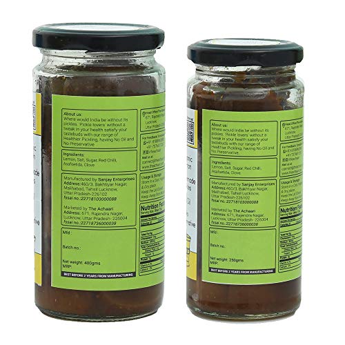 The Achaari Nimbu Red Chilli, 100% No Oil & No Preservative, Homemade Lemon Pickle, Combo Pack (400grams + 250grams)