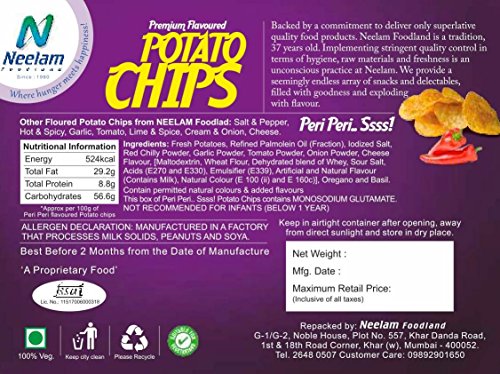 Fresh Potatoes Refined Palmolein Oil Iodized Salt Red Chilly Powder Garlic Powder Tomato Powder Onion Powder Cheese Flavour Oregano Basil