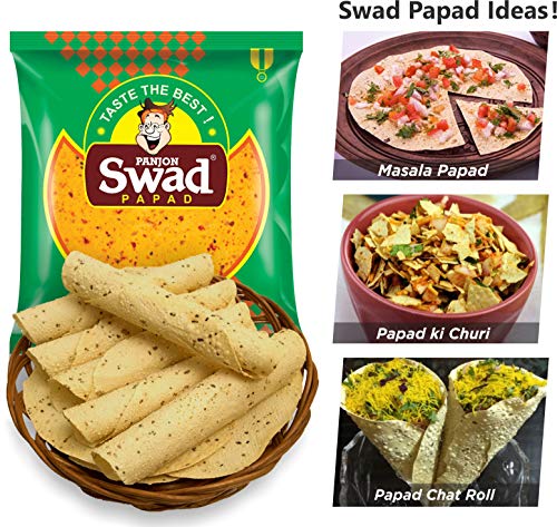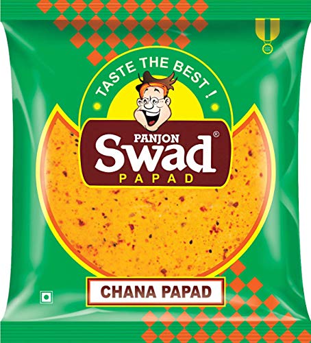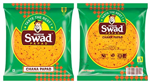 Swad Chana Special Papad (Medium Spicy Authentic Rajasthani Taste 100% Cripsy & Tasty | Fried or Roasted | with Pickle or Chutney) Channa Dal Papad Snack 400g. Hygienically made with Quality Kitchen ingredients: Dal gram flour Salt Spices Asafoetida Hing Mirch Edible Oil etc. Authentic Traditional Taste curated by Home Chefs - Mothers. Helps in Digestion & Gut health. Prepares within 1 minutes Masala Papad Roll. 100% Vegetarian. 100% Tasty & Digestive. Quality from Swad - Panjon Limited. Best served with chutney pickle Khakra Chai Tea as a Crispy & Crunchy Snack. Swad Papads can be cooked in many ways! Ideal Snack for House Party Weddings Birthday Menu Anniversary Gift Ready to Eat. Also try all 5 flavours of Swad Papads - Swad Urad Papad Spicy Urad Papad Chana Papad Moong Papad & Kali Mirch Papad.