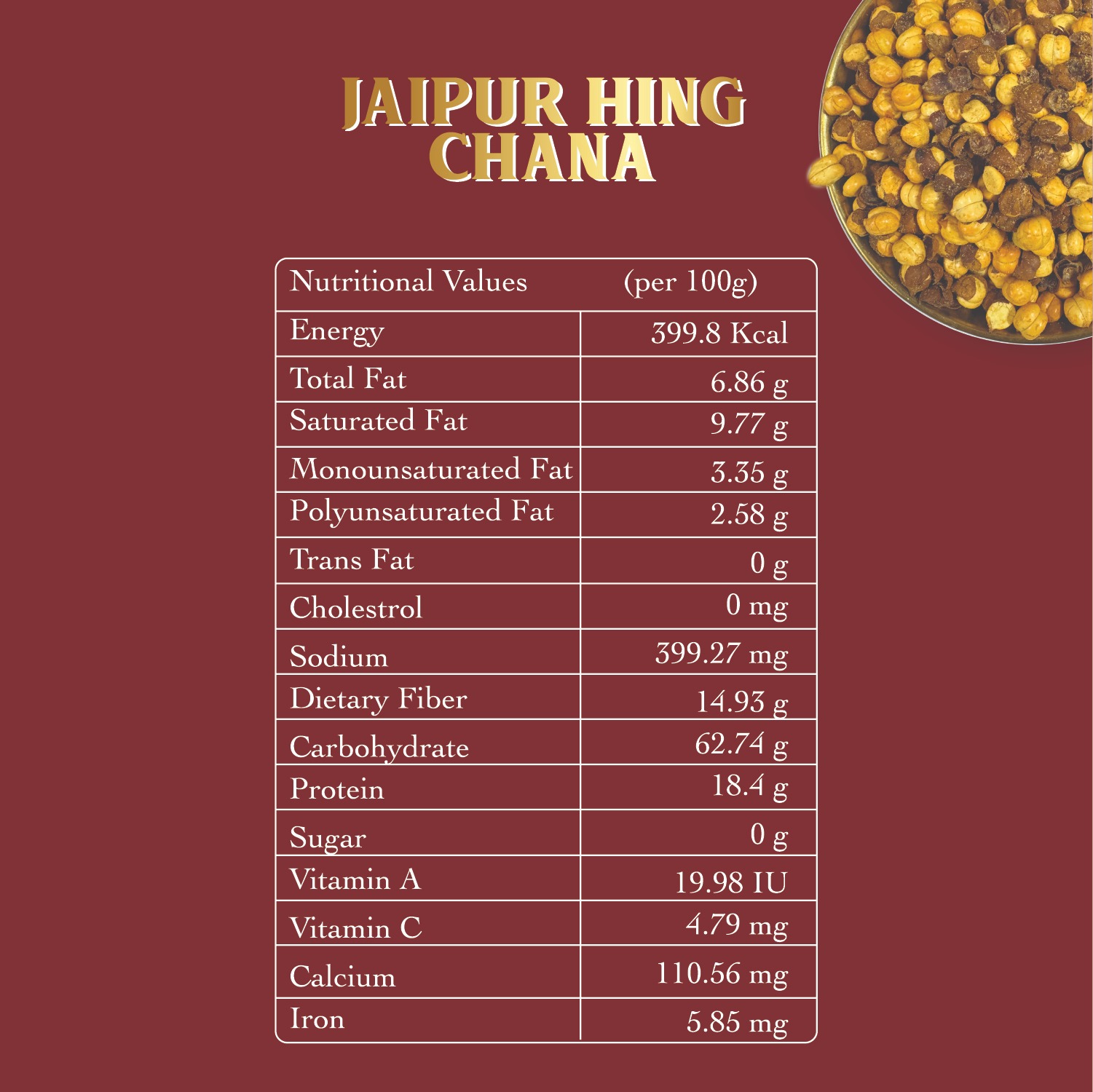 • Authentic Jaipur snack: Roasted Bengal gram chickpeas seasoned with aromatic asafoetida and a blend of traditional desi masalas.