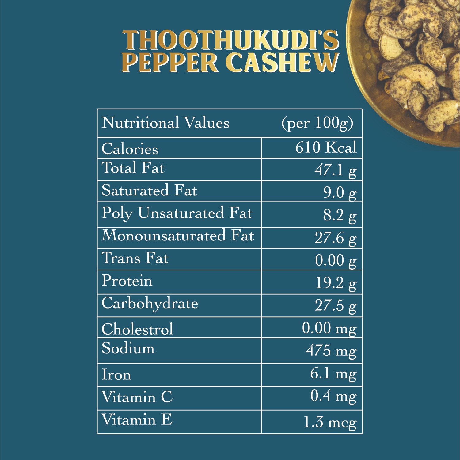 • Bold, authentic flavor: Hand-roasted cashews from Thoothukudi, coated with freshly cracked black pepper for a warm, lingering bite.