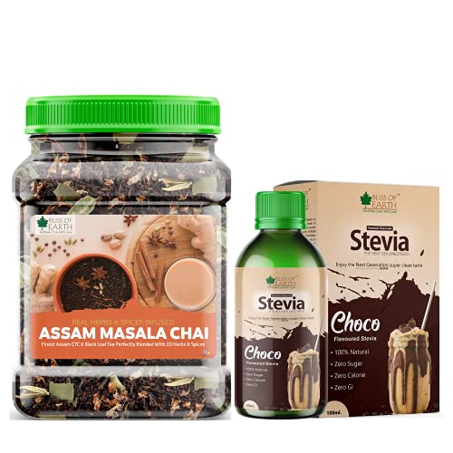 Bliss of Earth Combo Of Finest Assam Masala Chai (400gm) Blended CTC leaf infused with 20 real herbs & spices And Chocolate Stevia Liquid Flavoured Stevia (100 ml) Pack Of 2