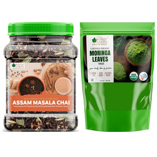 Bliss of Earth Combo Of Finest Assam Masala Chai (400gm) Blended CTC leaf infused with 20 real herbs & spices And Organic Moringa Leaves Powder (250gm) For Weight Loss Super Food (Pack Of 2)