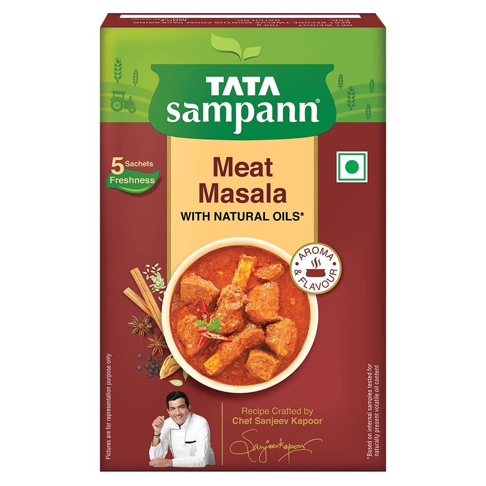 Tata Sampann Chicken Masala with Natural Oils Crafted by Chef Sanjeev Kapoor 100gTata Sampann Chicken Masala is specially crafted for you by Chef Sanjeev Kapoor to unleash the master chef within you. Tata Sampann spices are made to retain their natural oils ensuring each bite is aromatic and flavorful. Each pack comes with an exclusive Chef Tip to make every meal exciting! Now make tasty Chicken Curry at home and watch everyone lick their plates clean! Explore Tata Sampann Blended Spices Range â Pav Bhaji Masala Paneer Masala Chhole Masala Chaat Masala Dal Tadka Masala Meat Masala Kitchen King Masala and Garam Masala. Chef's Tip: Use fried onion paste instead of chopped onions to add a different dimension to the dish.Tata Sampann Meat Masala with Natural Oils Crafted by Chef Sanjeev Kapoor 100gTata Sampann Meat Masala is specially crafted for you by Chef Sanjeev Kapoor to unleash the master chef within you. Tata Sampann spices are made to retain their natural oils ensuring each bite is aromatic and flavorful. Each pack comes with an exclusive Chef Tip to make every meal exciting! Now make mouth watering Mutton Masala at home and watch everyone lick their plates clean! Explore Tata Sampann Blended Spices Range â Pav Bhaji Masala Paneer Masala Chhole Masala Chicken Masala Dal Tadka Masala Chaat Masala Kitchen King Masala and Garam Masala. Chef's Tip: Marinate the mutton with ginger-garlic paste and Mutton Masala for 15-20 minutes to add a depth of flavours.