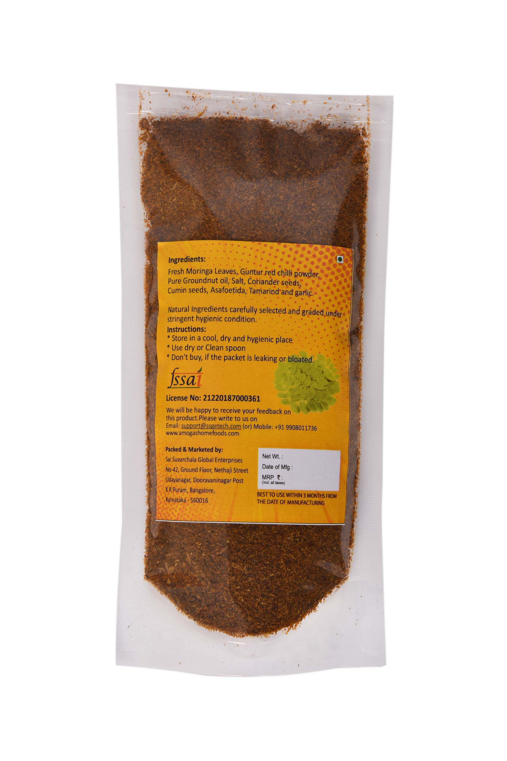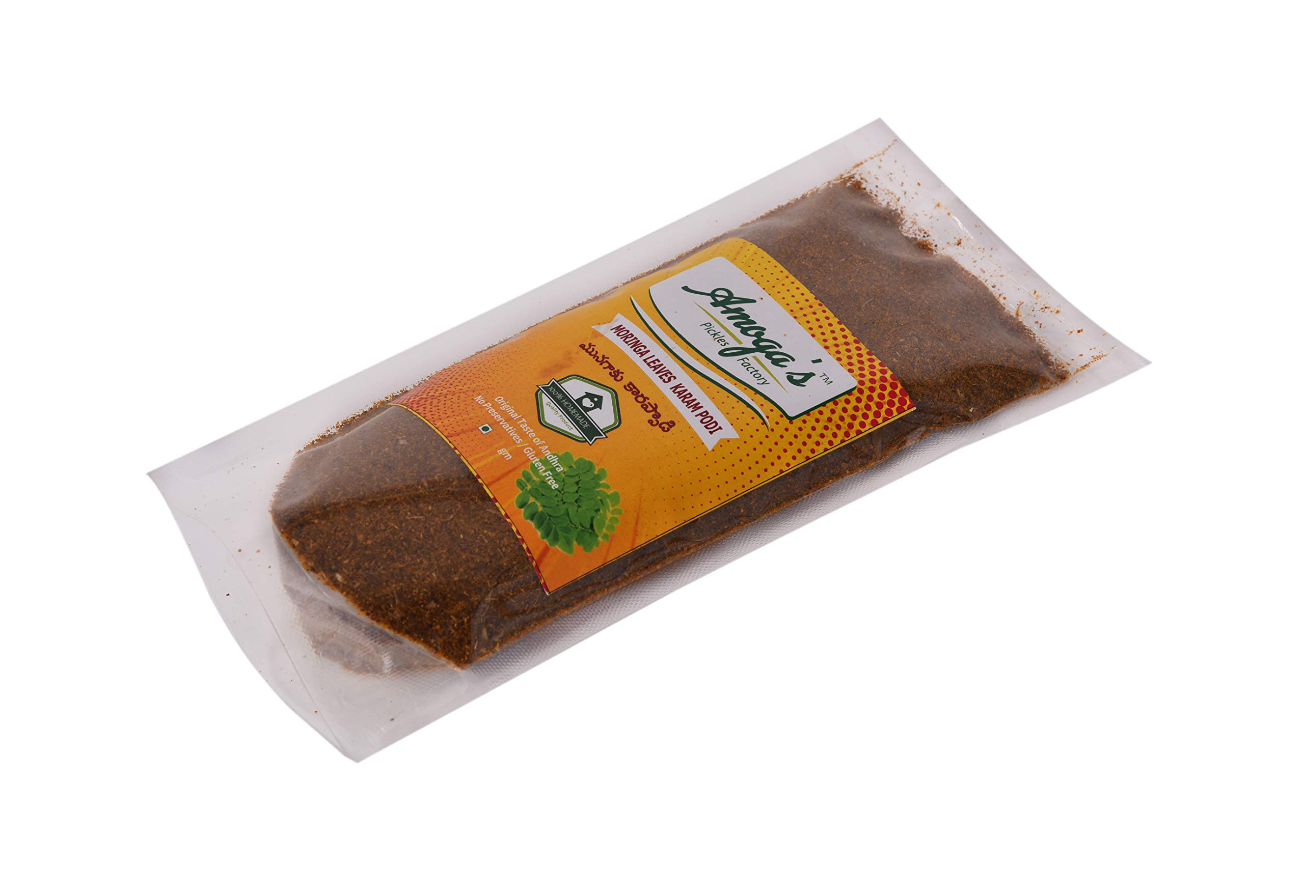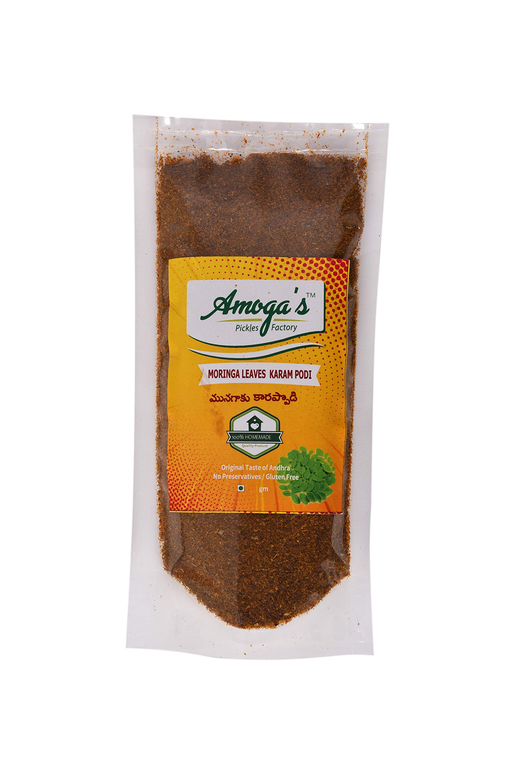 Moringa Leaves or Drumstick Leaves Karam Podi well goes with Hot Rice Idli Roti Paratha and Chapati very well.Moringa is very Nutritious LeavesThis leaves retain lots of vitamins and minerals.Moringa leaves are rich in amino acids the building blocks of proteins.Moringa leaves have anti-oxidative properties and protect against the damaging effects of free radicals present in the environment.Moringa leaves are beneficial against digestive disorders.Amoga's Pickles Factory brings you best product with respect the health and taste with Moringa Leaves Karam Podi.