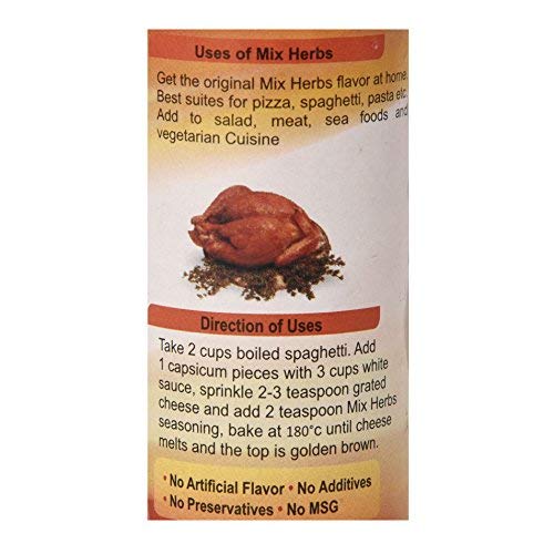 Mix Herbs Seasoning - 100% Pure & Natural 10 gm No artificial flavour & -when compared with sun dried or freeze dried our products are found to yield all the qualities like color, flavor, aroma, taste, rehydration ,nutritional values and increased shelf life property to an unmatchable extent taking it very close to the fresh ones and makes our technology the best drying technology of the present era. is committed to supply quality products. We work with thousands of small family farmers in India to cultivate thousands of acres of sustainable organic farm land. By choosing products you are not only getting pure solid matter but also spiritual vibrations imbibed nanoscopically during processing. proves itself to be your right choice.