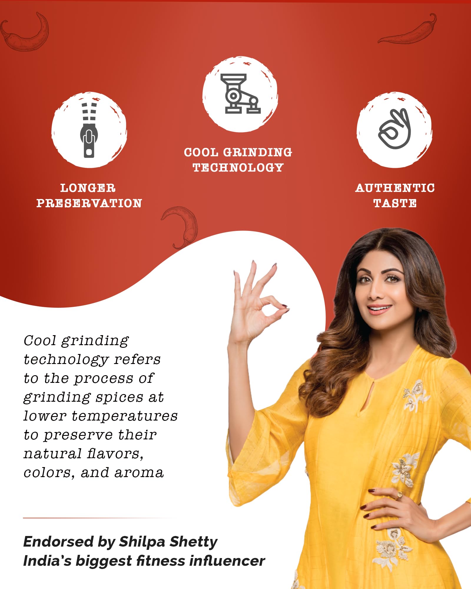 Retained Aroma The cool technology used in grinding preserves the natural aroma of the red chillies. This ensures that your dishes are infused with a rich and enticing fragrance enhancing the overall dining experience.