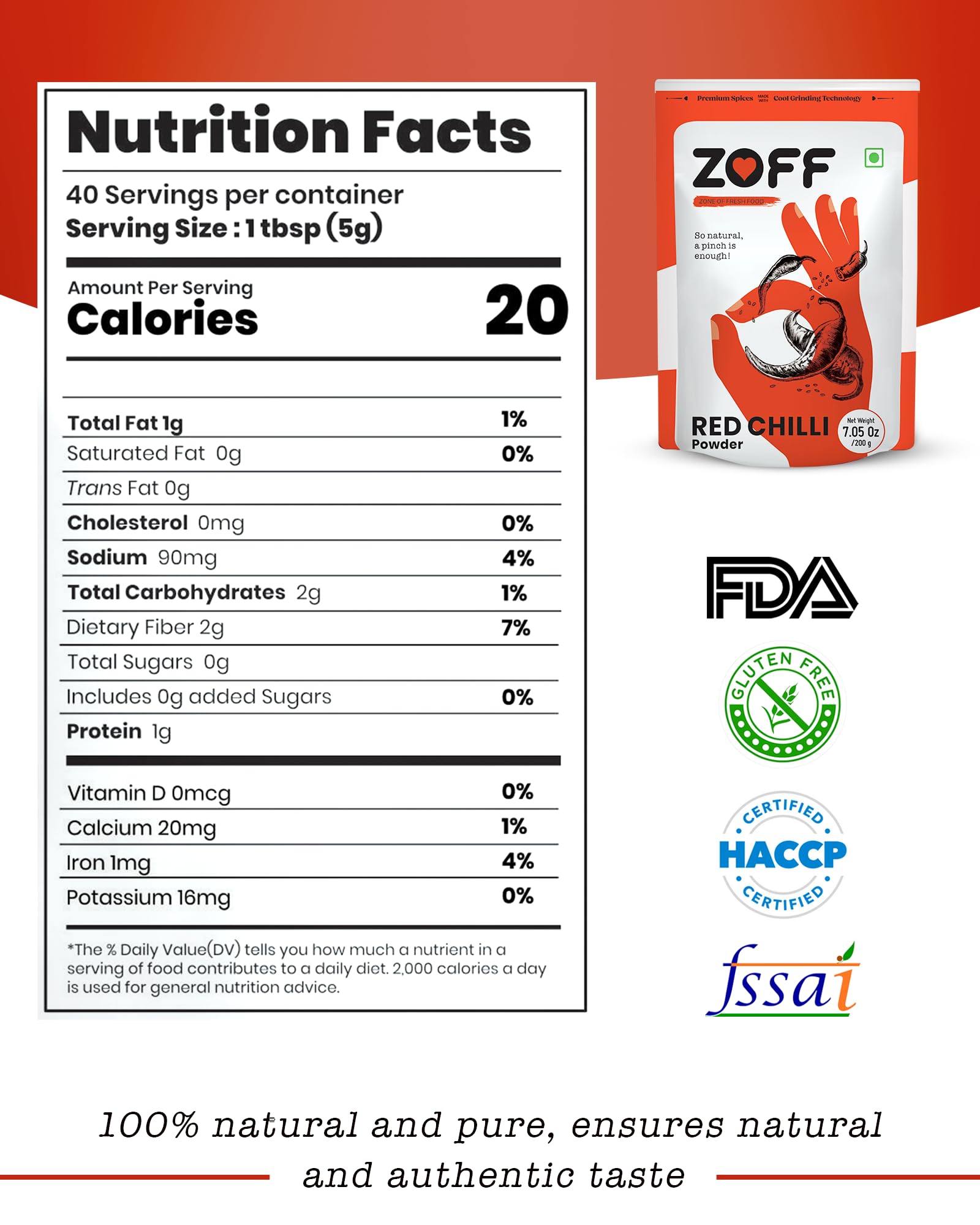 High Quality Sourcing Zoff's Red Chilli Powder is sourced from hand picked red chillies from India's finest gardens ensuring top notch quality and authentic flavor.