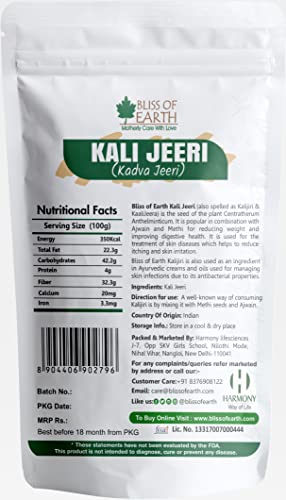 Bliss of Earth Kali Jeeri (also spelled as kalijiri & kaali Jeera) is the seed of the plant Centratherum anthelminticum. It is poplar in combination with Ajwain and Methi for reducin weight and improving digestive health. It is used for the treatment of skin which helps to reduce itching and skin irritation. Bliss of Earth Kalijiri is also used as an ingredient in Ayurvedic creams and oils used for managing skin infections due to its antibacterial properties.