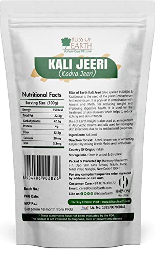Bliss of Earth Kali Jeeri (also spelled as kalijiri & kaali Jeera) is the seed of the plant Centratherum anthelminticum. It is poplar in combination with Ajwain and Methi for reducin weight and improving digestive health. It is used for the treatment of skin which helps to reduce itching and skin irritation. Bliss of Earth Kalijiri is also used as an ingredient in Ayurvedic creams and oils used for managing skin infections due to its antibacterial properties.