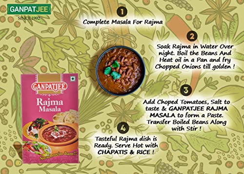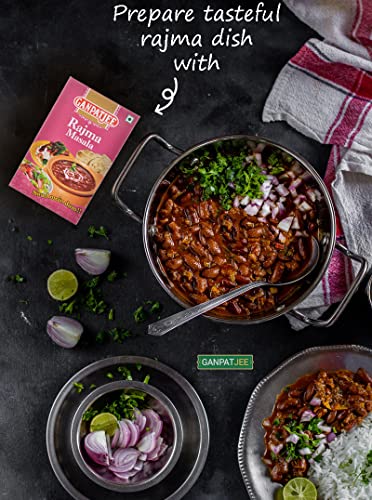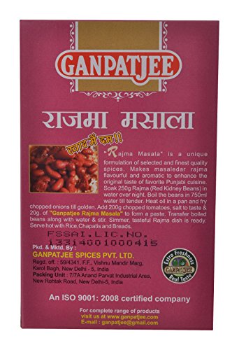 About Ganpatjee Ganpatjee believes in superior quality products with the best quality ingredients packed with due care .Rajma Masala 100 gmRajma Masala is a unique formulation of selected and finest quality spices. Makes Masaledar rajma flavourful and aromatic to enhance the original taste of Punjabi Cusine. It is a perfect blend of spices to enhance the taste of your dishes. It is a pack of 100 gm with exotic species to experience the most satisfying meal. Soak 250 gm Rajma (Red Kidney Beans) in water overnight. Boil the beans in 750 ml water till tender. Heat oil in the pan and try chopped onions till golden. Add 200 gm chopped tomatoes salt to taste and 20g of Ganpatjee Rajma Masala to form a paste. Transfer boiled beans along with water and stir. Simmer Taste Rajma dish is ready.Product Specifications:Product:Rajma MasalaQuantity:100 GramIngredients: Coriander Leaves Dry Mango Red Chillies Cumin Black Pepper Pomegranate Seeds Kachri Ionized Salt Black Salt Big Cardamom Cassia Dry Ginger Turmeric Fenugreek Leaves Cloves Mint Nutmeg Mace Tejpatta Green Cardamom AsafoetidaProduct FeaturesGood quality authentic taste for everyoneIt gives you more energy and is served with all Indian meals. Enjoy the taste of IndiaVegetarian Product! No Artificial colours and No additivesIt is a mixed spices powder with no curries added.Package Includes:1* Rajma Masala 100 Grams
