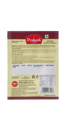 HomeGrocerySpicesPowdered SpicesGaram MasalaPrakash Blended Spices Sunday Garam Masala 500 gram | Ready to Use Garam Masala | Easy to cook | Authentic Maharashtra Spices | Serves 4 | No Preservatives Colours or Artificial Flavours