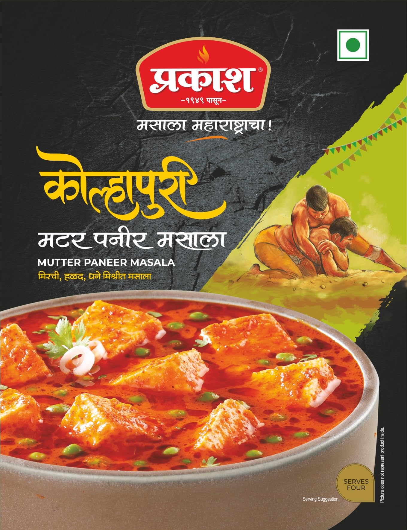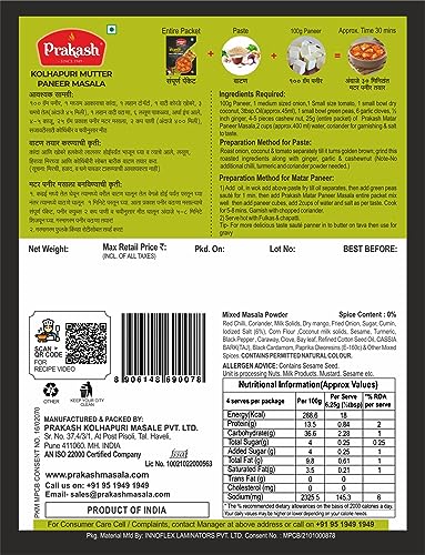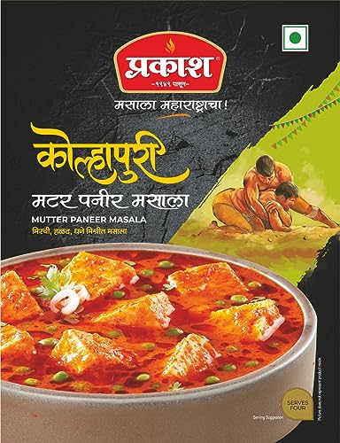 HomeGrocerySpicesPowdered SpicesGaram MasalaPrakash Kolhapuri Mutter Paneer Masala 25 GM | Pack of 4 | Ready to Use | Easy to cook | Authentic Maharashtra Spices | Serves 4 (Per Pack) | No Preservatives Colours or Artificial Flavours