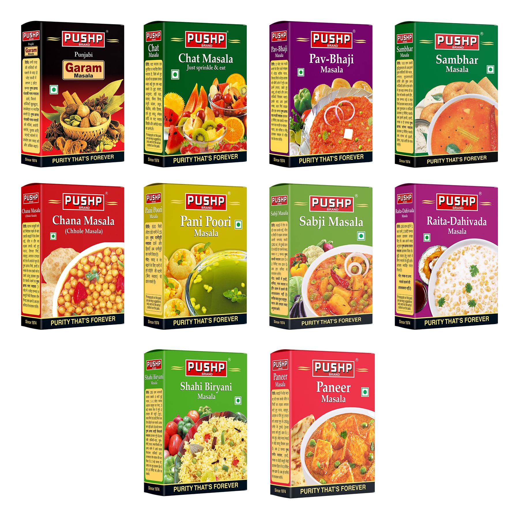 Pushp Brand Combo Pack 50g Each (Punjabi Garam Masala Chana Masala Chat Masala Pav Bhaji Masala Sambhar Masala Biryani Masala Paneer Masala Sabji Masala Raita Masala Pani Puri Masala)