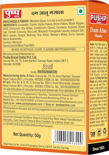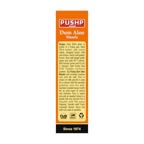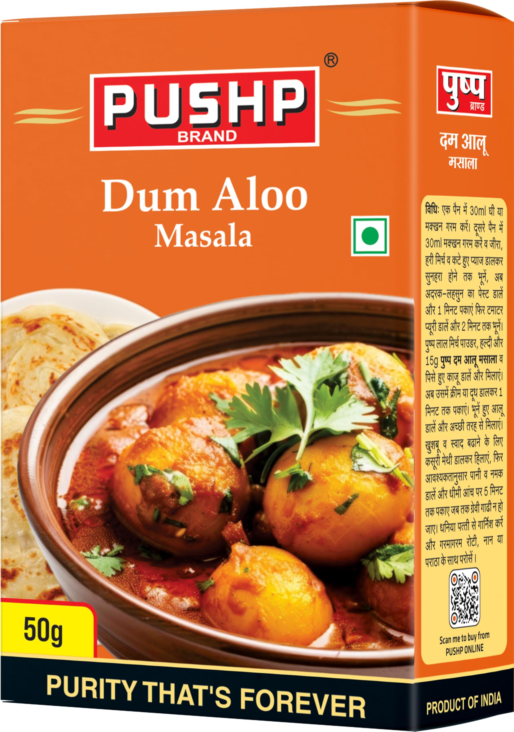 Bring the rich traditional taste of North Indian cuisine right to your kitchen with Pushp Dum Aloo Masala. Crafted with a meticulous selection of over 25 premium spices this 50g spice mix is your go-to secret for preparing restaurant-style Dum Aloo at home. Whether you're hosting a dinner party or cooking a cozy family meal Pushp Dum Aloo Masala delivers unmatched flavor purity and aroma in every bite.