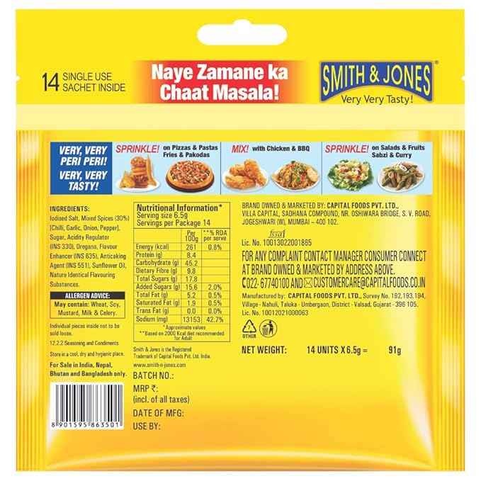 Peri Peri - A Spice Mix from the house of Smith & Jones. It is a Spice mix which is tangy and spicy hot in flavour. It can be used as a Mix or a Sprinkler. It is popularly known as the modern day chaat masala. Experience the exotic spicy twist with a tangy note that turns your food extra delicious. You can add this to your Fries, Pastas, Pizzas, Pakoras, Chicken, BBQ, Salads, Fruits, Sabzi, Curry, Chaats, Dals etc to make it more exciting. Kids will just love this twist on any snack.