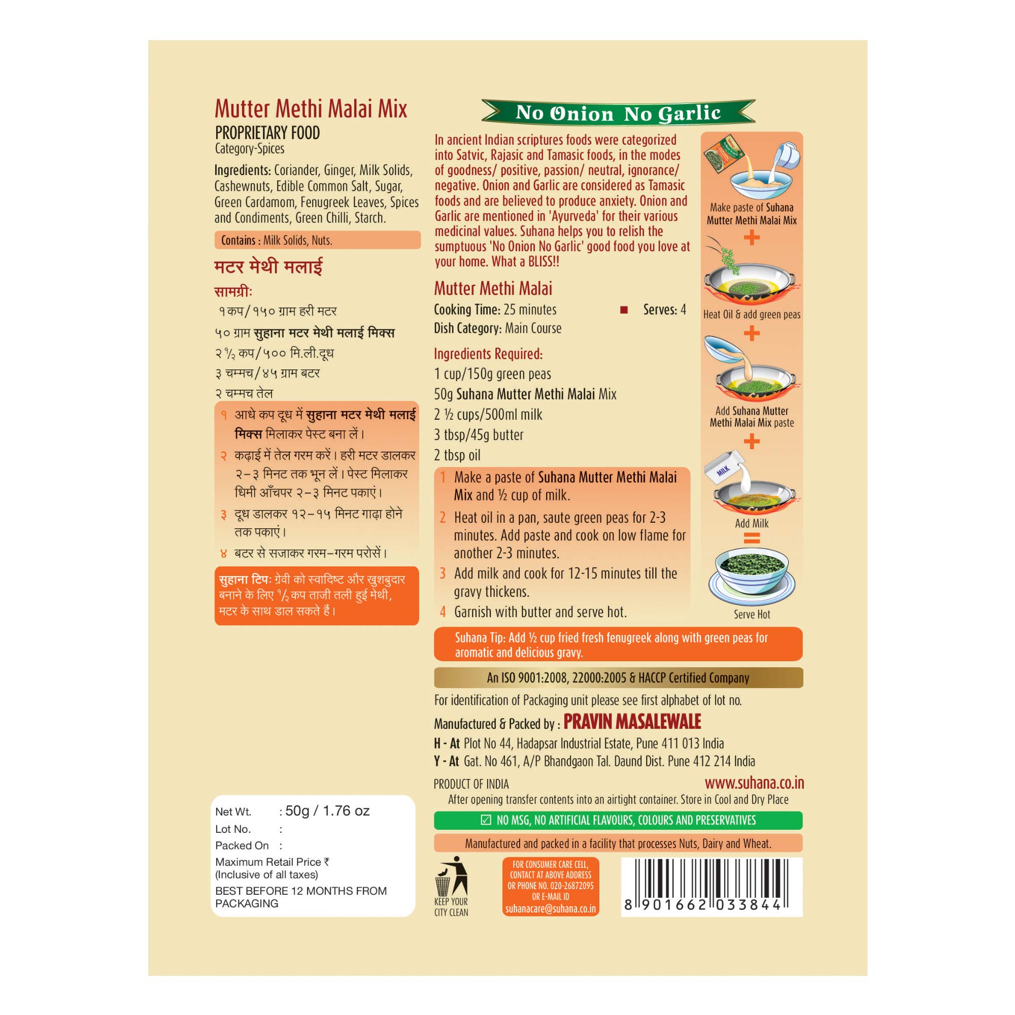 Mutter Methi Malai mix NONG 50GIn ancient Indian scriptures foods were categorized into Satvic Rajasic and Tamasic foods in the modes of goodness/ positive passion/ neutral ignorance/ negative. Onion and Garlic are considered as Tamasic foods and are believed to produce anxiety. Onion and Garlic are mentioned in Ayurveda for their various medicinal values. Suhana helps you to relish the sumptuous No Onion No Garlic good food you love at your home. What a bliss! Category: spicesIngredient: coriander ginger milk solids cashewnut edible common salt sugar green cardamom fenugreek leaves spices condiments green chilli starch. Cooking Time: 25 minutesDish Category: Main CourseServes: 4Steps / How to make: - Make a paste of Suhana Mutter Methi Malai mix and ½ cup of milk. - Heat oil in pan saute green peas for 2-3 minutes. Add paste and cook on low flame for another 2-3 minutes. - Add milk and cook for 12-15 minutes till the gravy thickens. - Garnish with butter and serve hot. Suhana Tip: - Add ½ Cup fried fresh fenugreek along with green peas for aromatic and delicious gravy. - NO MSG NO ARTIFICAL FLAVOURS COLOURS AND PRESERVATIVES. - MANUFACTURED AND PACKED IN A FACILITY THAT PROCESSES NUTS DAIRY AND WHEAT. BEST BEFORE 12 MONTHS FROM PACKAGING