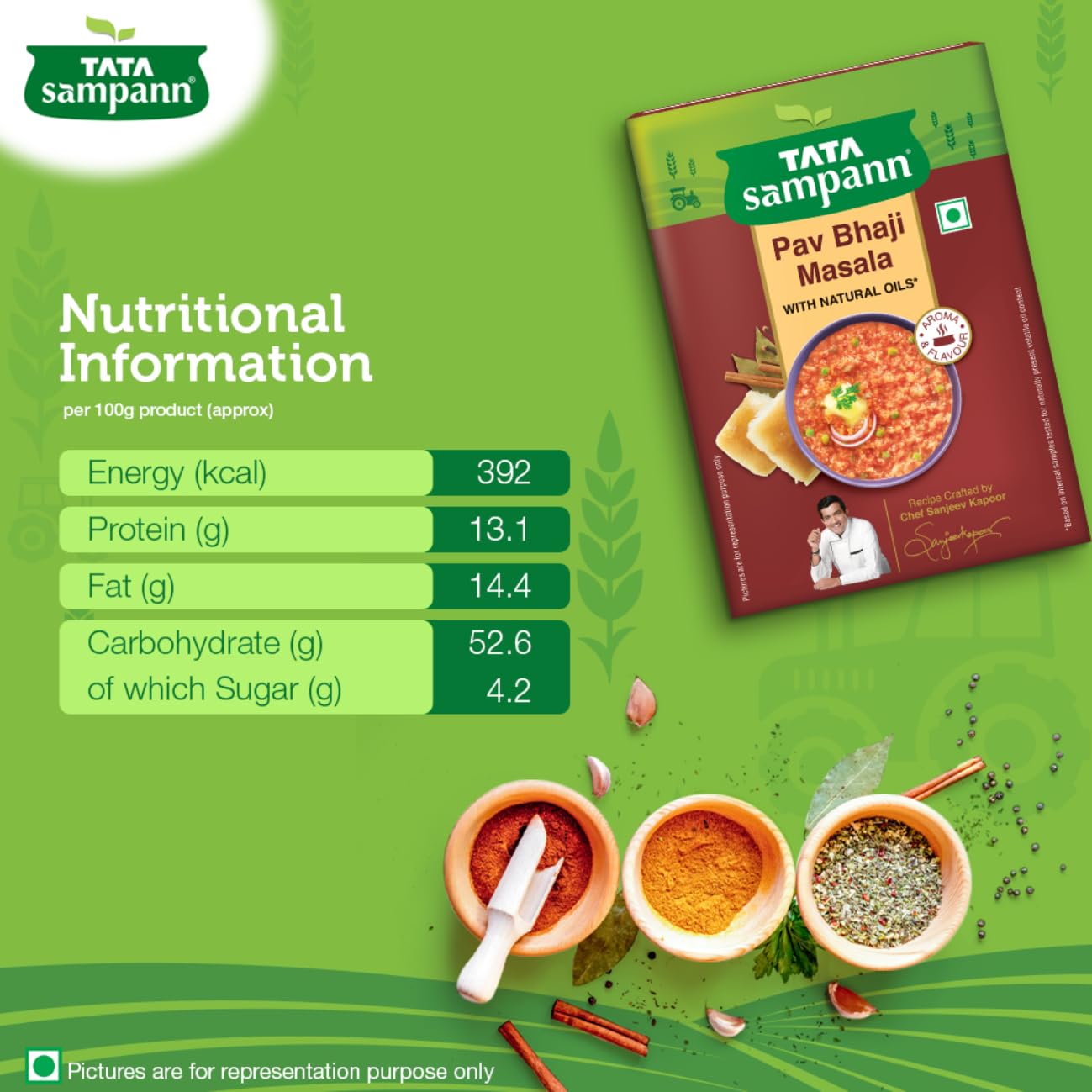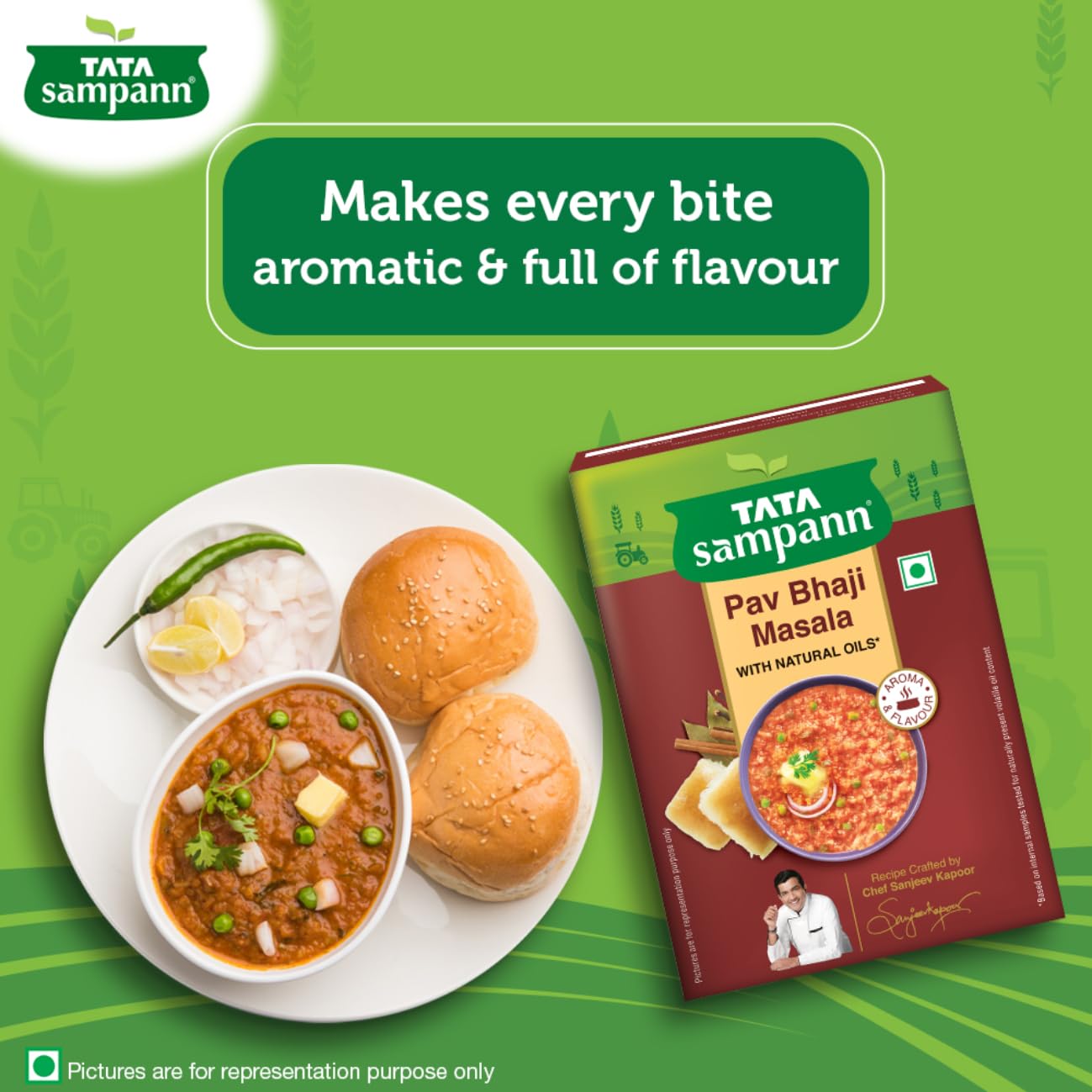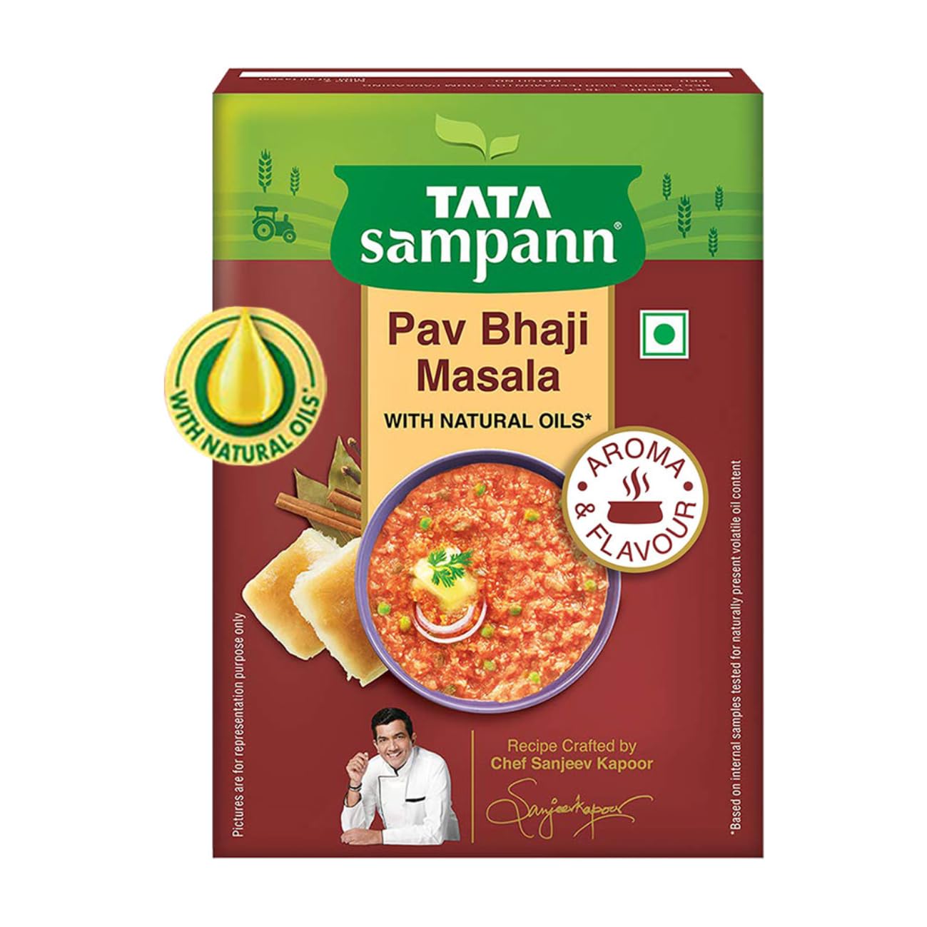 There is nothing like cooking your favourite dishes at home with the same taste and flavour that you get outside hence Tata Sampann brings you its range of blended spices to make all your dishes extra special! Introducing Tata Sampann Pav Bhaji Masala made from whole spices that retain their natural oils making every bite aromatic and full of flavour. This masala contains dagad phool or stone flower which adds an earthy flavour to the spice mix. Sourced from the best of farms the recipe contains naturally rich masalas and is specially crafted by Chef Sanjeev Kapoor. The pav bhaji masala comes in an innovative 5-sachet packaging that locks in freshness for longer. Now make street-style pav bhaji at home and watch everyone lick their plates clean! Keep in a cool and dry place. Do not purchase if pack is punctured or tampered with. Explore Tata Sampann Blended Spices Range â Chicken Masala Paneer Masala Punjabi Chole Masala Dal Tadka Masala Meat Masala Kitchen King Masala and Garam Masala.