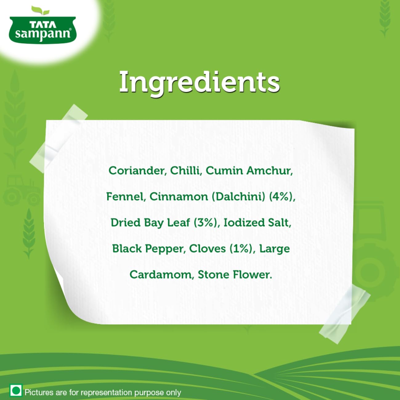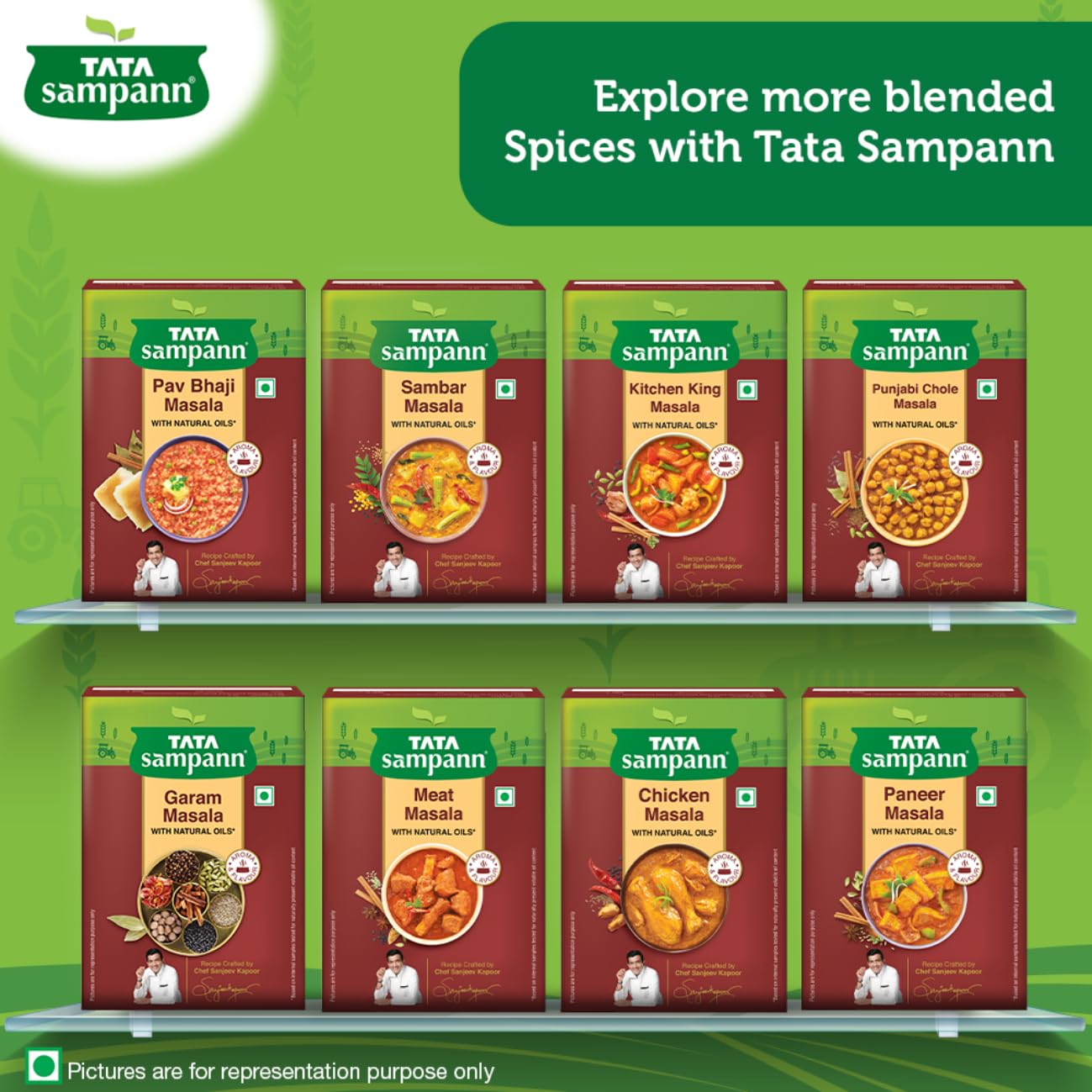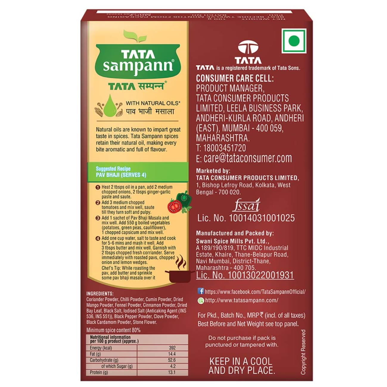 There is nothing like cooking your favourite dishes at home with the same taste and flavour that you get outside hence Tata Sampann brings you its range of blended spices to make all your dishes extra special! Introducing Tata Sampann Pav Bhaji Masala made from whole spices that retain their natural oils making every bite aromatic and full of flavour. This masala contains dagad phool or stone flower which adds an earthy flavour to the spice mix. Sourced from the best of farms the recipe contains naturally rich masalas and is specially crafted by Chef Sanjeev Kapoor. The pav bhaji masala comes in an innovative 5-sachet packaging that locks in freshness for longer. Now make street-style pav bhaji at home and watch everyone lick their plates clean! Keep in a cool and dry place. Do not purchase if pack is punctured or tampered with. Explore Tata Sampann Blended Spices Range â Chicken Masala Paneer Masala Punjabi Chole Masala Dal Tadka Masala Meat Masala Kitchen King Masala and Garam Masala.